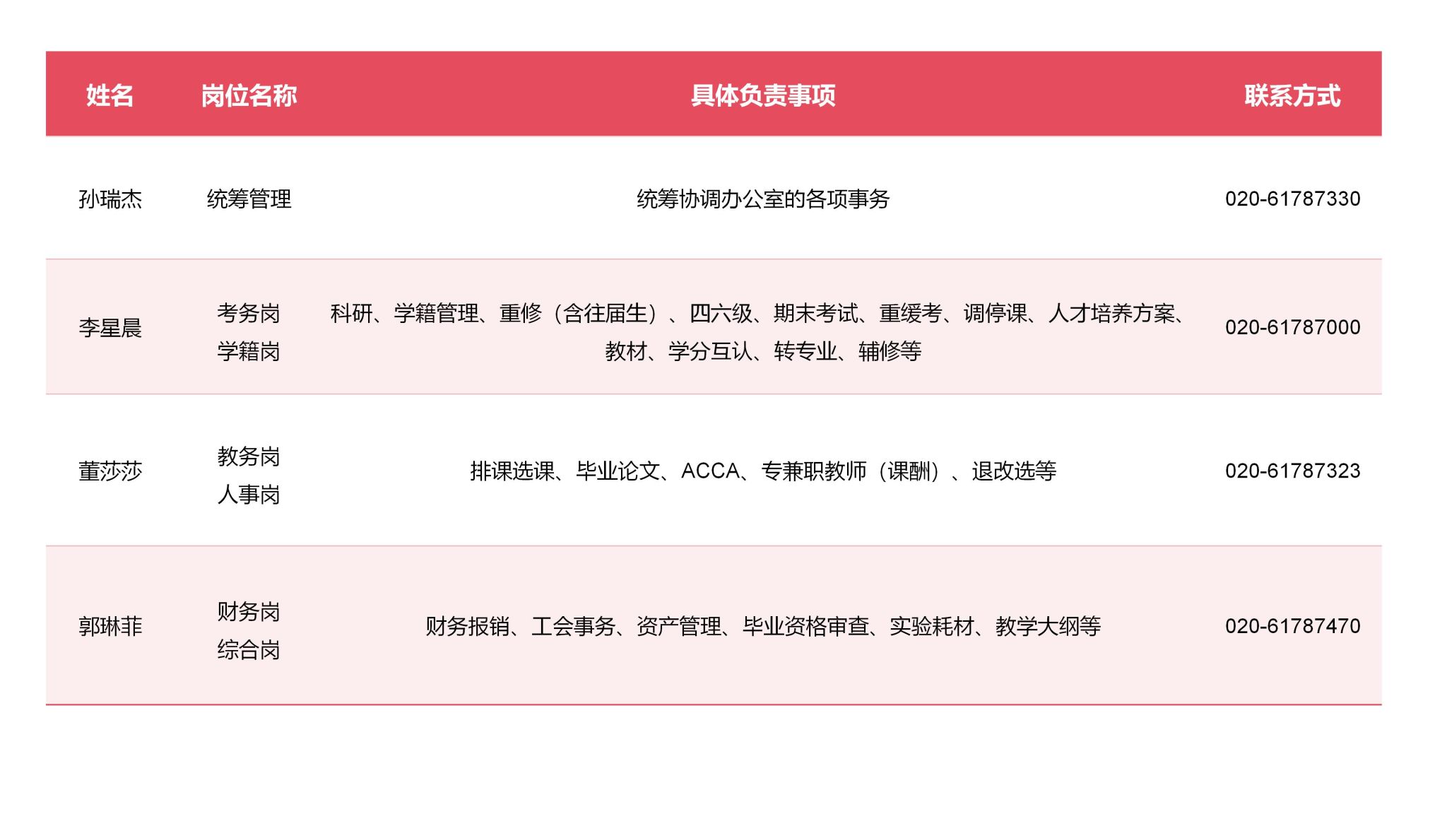 为健全信息沟通渠道,提升管理服务效能,本栏目将学院办公室教师分工及联系方式予以公示。