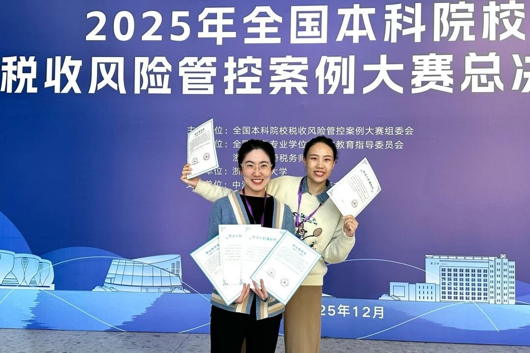 近日,由我校会计学院教师由姚懿轩、高旭冉老师指导的宋雨恩、陈都、袁芷璐三位同学在2025年全国本科院校税收风险管控案例大赛全国总决赛中表现优异,荣获全国总决赛三等奖。
