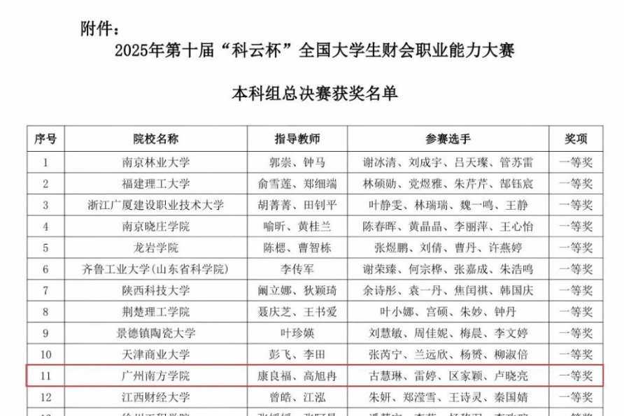 近日,由会计学院康良福、高旭冉老师指导的“极客商侠队”(成员:古慧琳、雷婷、区家颖、卢晓亮),在2025年12月20日圆满落下帷幕的第十届“科云杯”全国大学生财会职业能力大赛全国总决赛中表现优异,荣获全国总决赛一等奖(位列全国第十一名,全省第一名)。