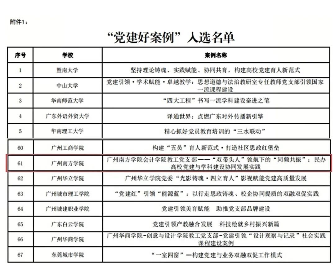 近日,中共广东省委教育工委公布 “党建好案例、书记好党课、党员好榜样” 优秀成果入选结果,广州南方学院会计学院教工党支部申报的《“双带头人” 领航下的 “同频共振”:民办高校党建与学科建设协同发展实践》成功入选 “党建好案例”(序号 61),获省委教育工委权威认可!