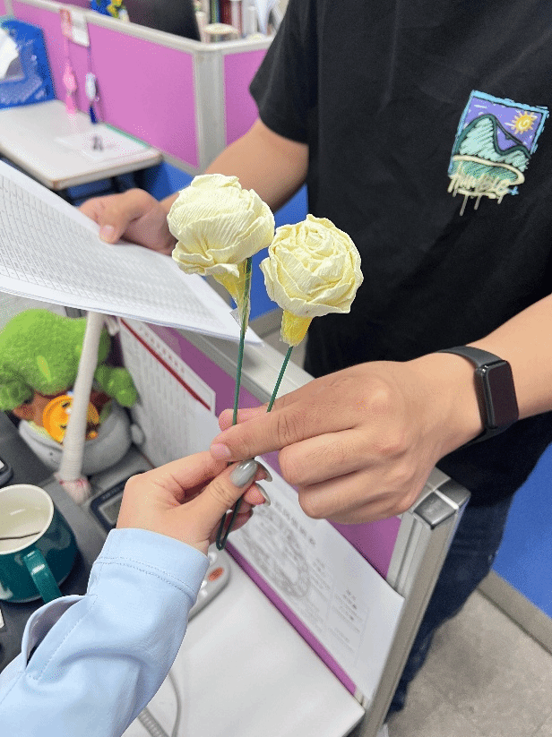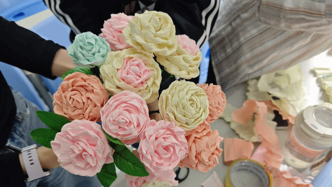 随后,区家颖同志详细讲解了纸花制作的方法、步骤及注意事项。讲解结束后,进入纸花制作环节,大家分组进行动手实践,认真折叠、细心塑形。现场氛围温馨融洽,党员和入党积极分子们相互交流、互帮互助,有的向大家讲解花瓣塑形技巧,有的主动分享花束搭配心得,共同完成了一朵朵精致美观的纸花。整个制作过程既充满动手乐趣,又凝聚了团队力量,大家在实践协作中,让奉献互助的雷锋精神在指尖传递、在心中扎根。