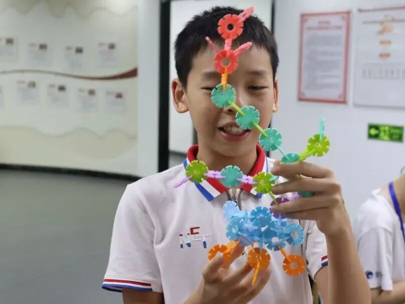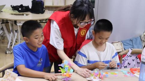 除了绘画,薪火筑梦团还准备了有趣的雪花积木让孩子们自行搭建。有的孩子将积木拼搭成造型独特的太空车,说要去探索宇宙;有的孩子将积木拼搭成轻便小巧的照相机,并举起来“咔嚓咔嚓” 拍照;还有的孩子把积木拼搭成精致典雅的皇冠,脸上洋溢着幸福与满足。团队成员在一旁仔细观察,时不时帮助孩子们调整积木的角度并稳固结构。大家一起分享搭建的灵感,整个服务站都沉浸在动手创造之中。