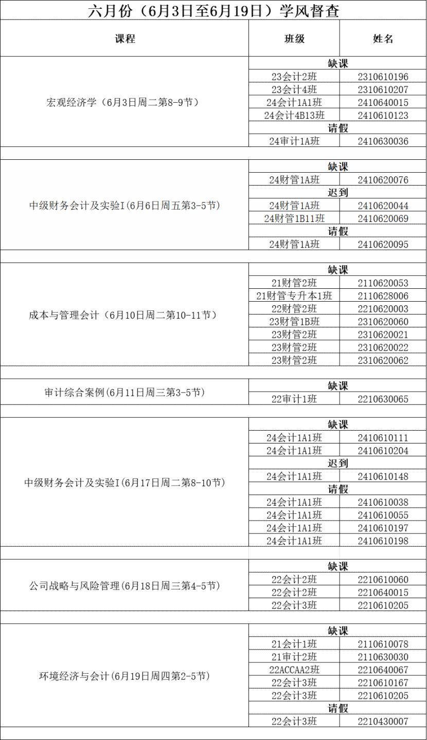 为加强广州南方学院会计学院良好学风建设,促进我院学生养成良好学习习惯,为我院营造良好学习氛围与环境,广州南方学院会计学院团委学生会进行了学风督查课堂考勤工作,现将六月份课堂考勤结果公示,公示时间为三天。