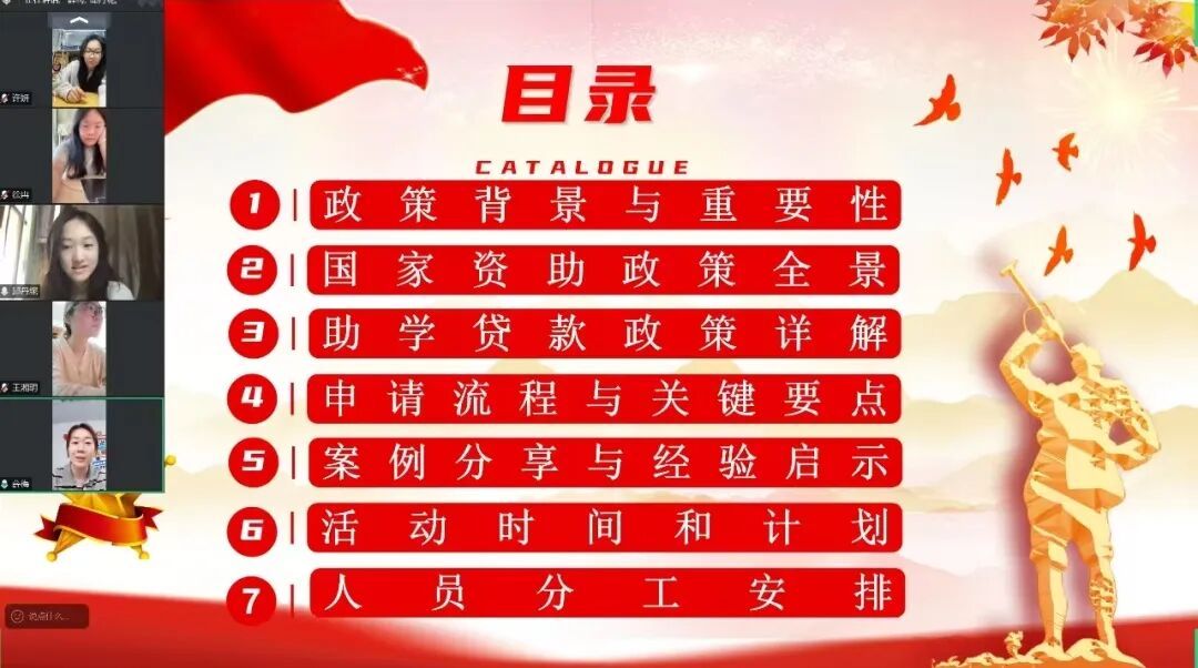 下乡行出发之前,点石成金队的队员进行线上培训会以及启征仪式,团队指导老师薛梅、陈宇桂以及全体成员共同参加。培训会上,队员们认真学习了国家资助和助学贷款政策的内容以及具体申请流程,深入理解了此次活动的意义。会议上,薛梅老师提出此次资助和助学贷下乡宣传活动意义重大,队员们作为宣传国家政策到千家万户中的“使者”,应强化自己的责任感和担当,提高安全意识,保护自身安全。陈宇桂老师则提出,队员们要注意入户宣传时和村民沟通的礼节,提高服务意识,确保沟通顺利。同时,会议还对接下来的活动安排做了详细的规划,队员们分工明确,充满信心。