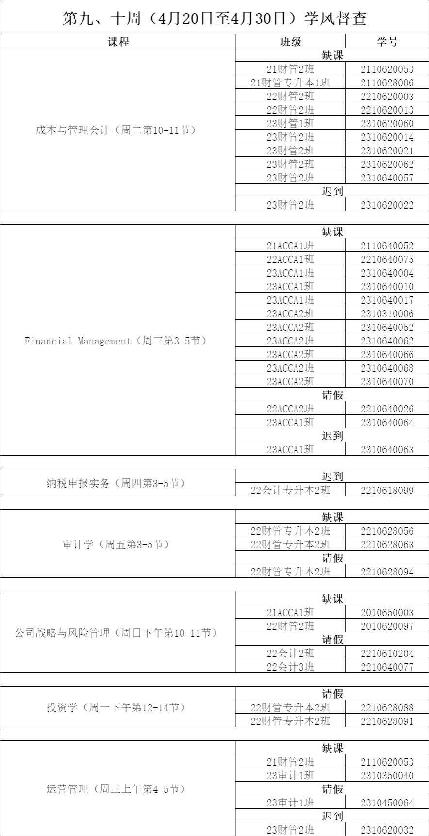 现将4月20日至4月30日(第九周—第十周)考勤情况公示如下: