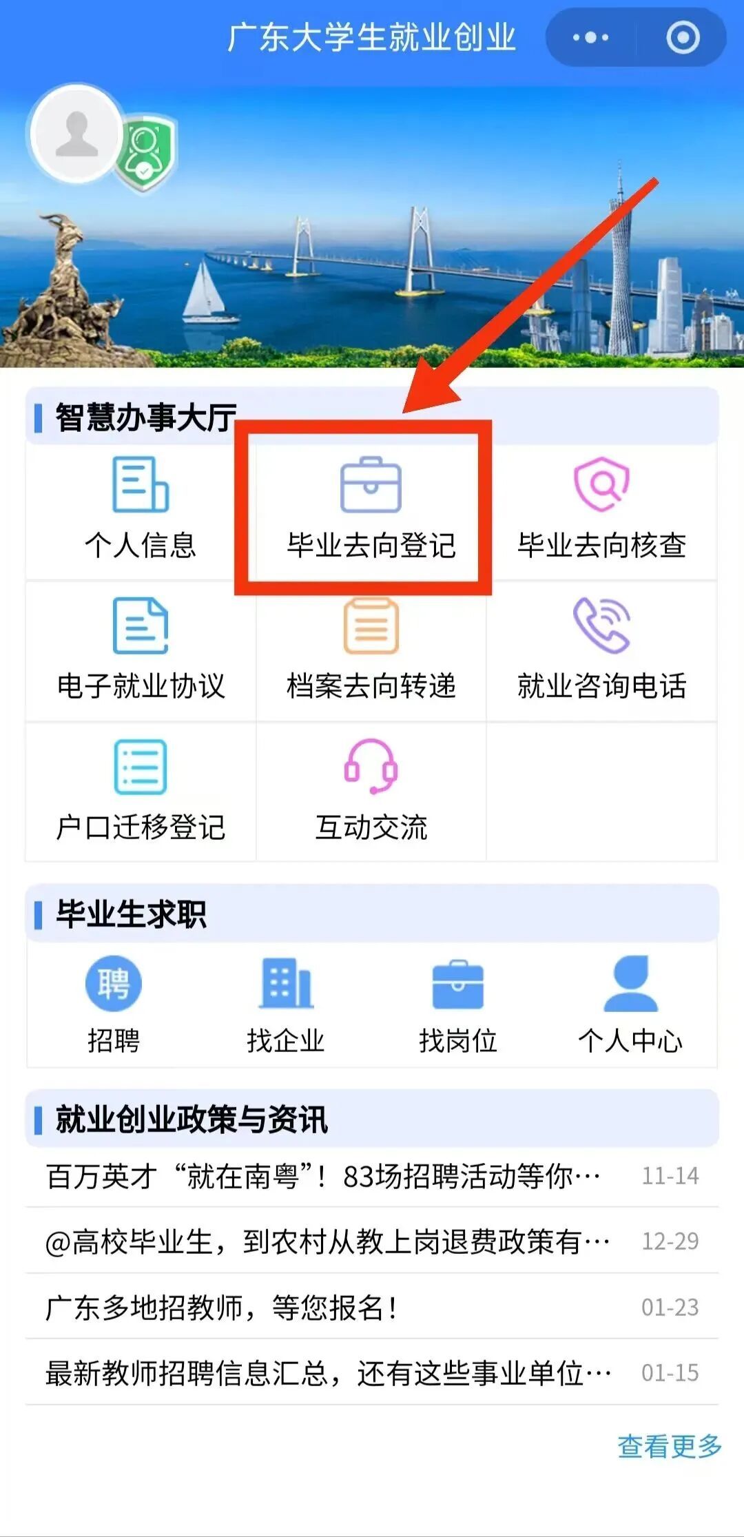 注:须先完成生源上报,如还没完成生源上报,请先点击“个人信息”完成生源上报后再进行去向登记。
