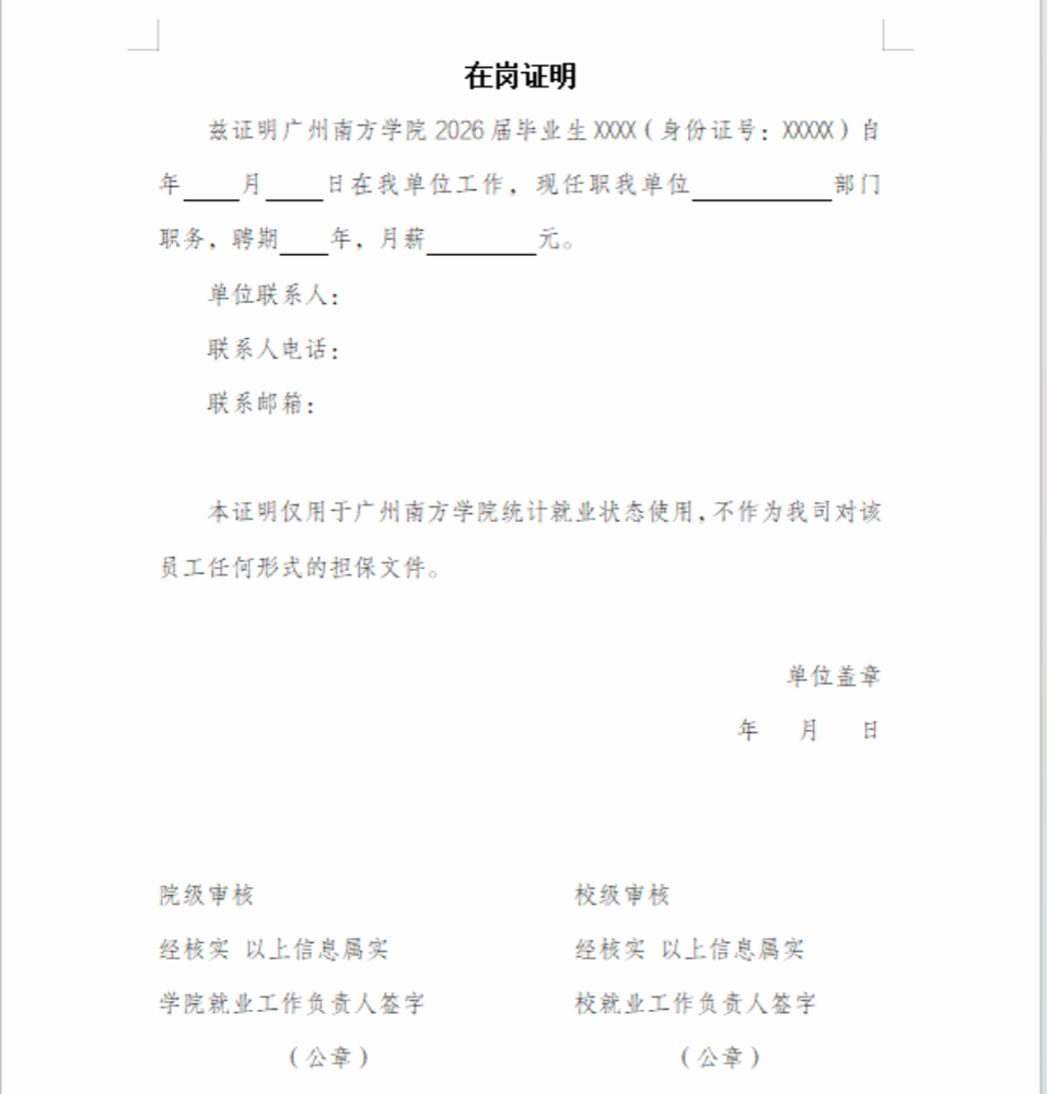 附件:须上传用人单位加盖公章的录用证明/聘用证明/在职证明/工资收入流水等材料,证明材料应包含的内容:1.毕业离校后聘用期限不低于6个月;2.工资收入不低于当地最低工资标准;3.须经学院以及学校老师共同审核签章。证明材料模板见下文(模板仅供参考,具体情况请以实际要求为准)