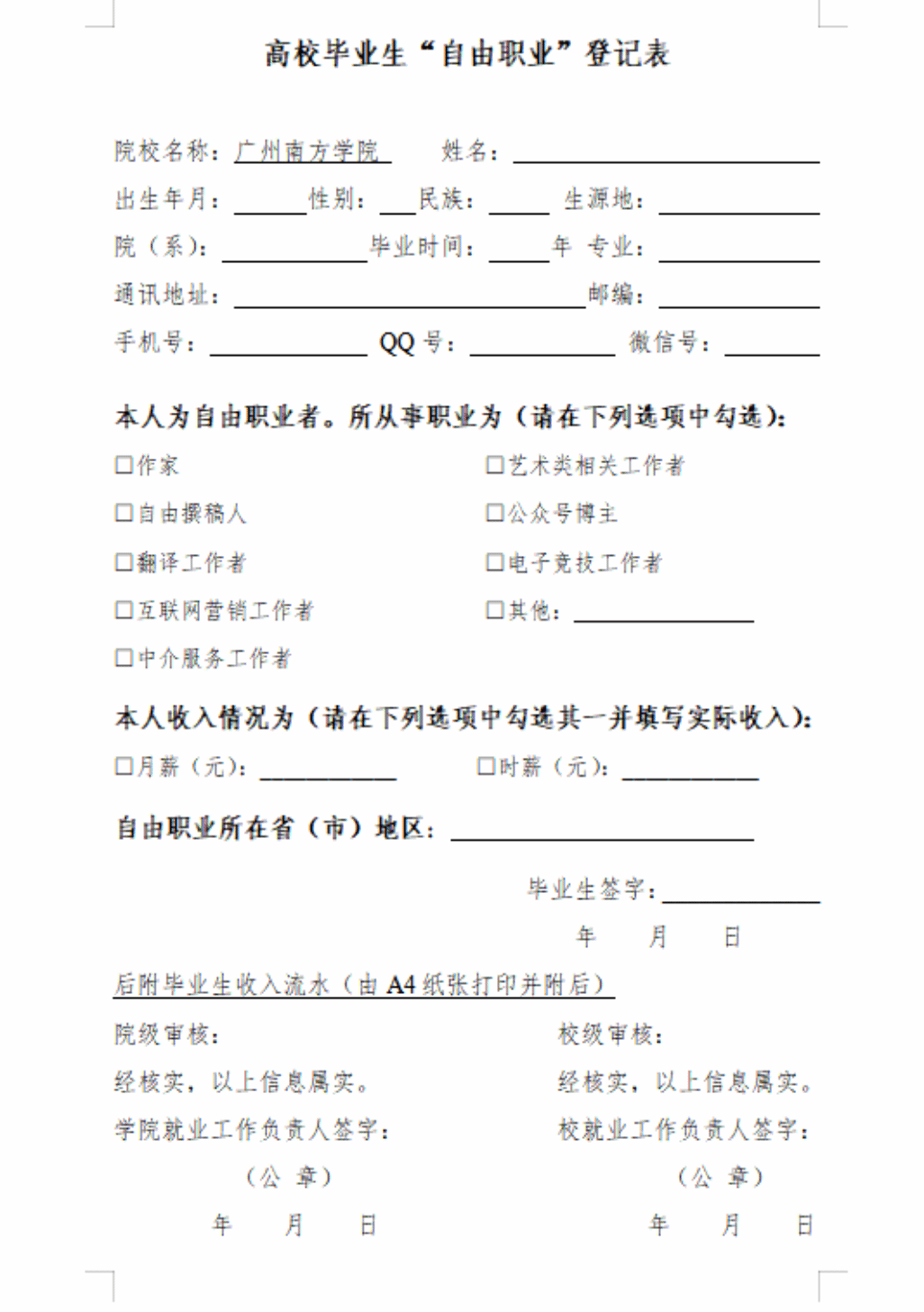 附件请务必按要求上传:1.毕业生本人近三个月不低于当地人社部门规定的最低月收入流水;2.经学院和学校共同签章的自由职业登记表(可参考下方模板)。
