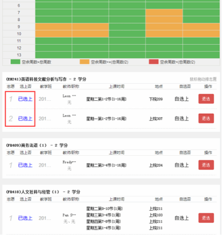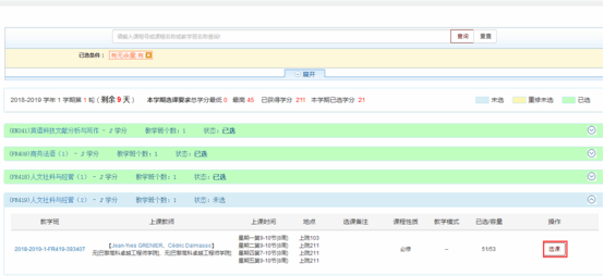 1. 学生可选择课程中的某门教学班加选,已修和已加选的课程不能再进行加选,已申请加选待审核的加选课程撤回加选申请方可重新选择教学班。