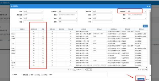 按照课程性质等数据筛选课程后选择需要报名的教学班,可以查看教学班当前的容量,填写报名原因后,点击提交申请按钮