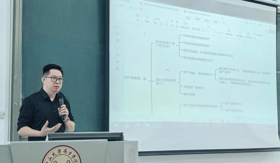 最后,莫斌彬老师进行了“实务导师案例教学分享——以某贝餐饮热点为例”的精彩交流。他从新教师和学生的双重视角出发,深入剖析了不同群体对“实务教师”角色的期待与需求,并分享了自己对实务老师角色的独到见解。莫老师还结合自身丰富管理学教学经验,系统梳理了学生职业规划方向,详细阐述了如何通过案例分析与课外实践,精准培养学生就业所需的核心技能。最后以“某贝餐饮”事件为例,融入管理学理论教学,生动诠释了实务案例如何有效服务理论教学、无缝融入课堂。