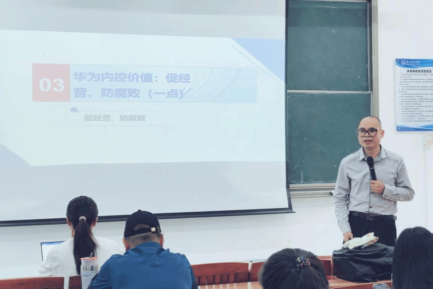 随后,作为曾深耕华为内控领域的从业者,李水房老师以“华为内控:促经营与防腐败的统一”为题,总结分享了华为公司内控体系的先进经验。他介绍了华为以COSO模型为理论基础,构建的“一点两面三三制”的内控框架,即以促经营、防腐败为目标,以流程和组织为支撑,通过三层审结、三道防线、三个工具实现高效运营。这一分享将全球领先企业的管理实践引入课堂,为教师们提供了鲜活的一手教学案例,极大地拓展了教学视野。