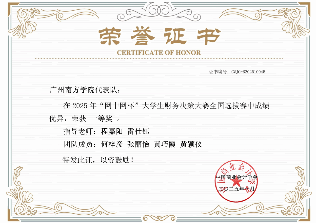 2025年10月12日,“网中网杯”大学生财务决策大赛全国选拔赛线上赛事圆满落幕。广州南方学院会计学院从校内选拔赛中角逐出的两支精英队伍——“小白进阶版”与“网贷大队”,代表学校征战全国选拔赛,最终凭借过硬的专业实力与高效的团队协作,双双斩获全国选拔赛广东省一等奖(广东省共有32支队伍、全国共有493支队伍参加全国选拔赛)。