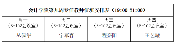为持续践行“以学生为中心”的教育理念,深化对学生学业发展与生涯规划的支持,会计学院本学期课后指导活动将于第九周起持续开展。第九周每周一至周四晚19:00-21:00,会计学院将继续在5教102会议室安排专任教师值班,为学生提供全方位的指导与答疑服务,欢迎各位同学积极参与。