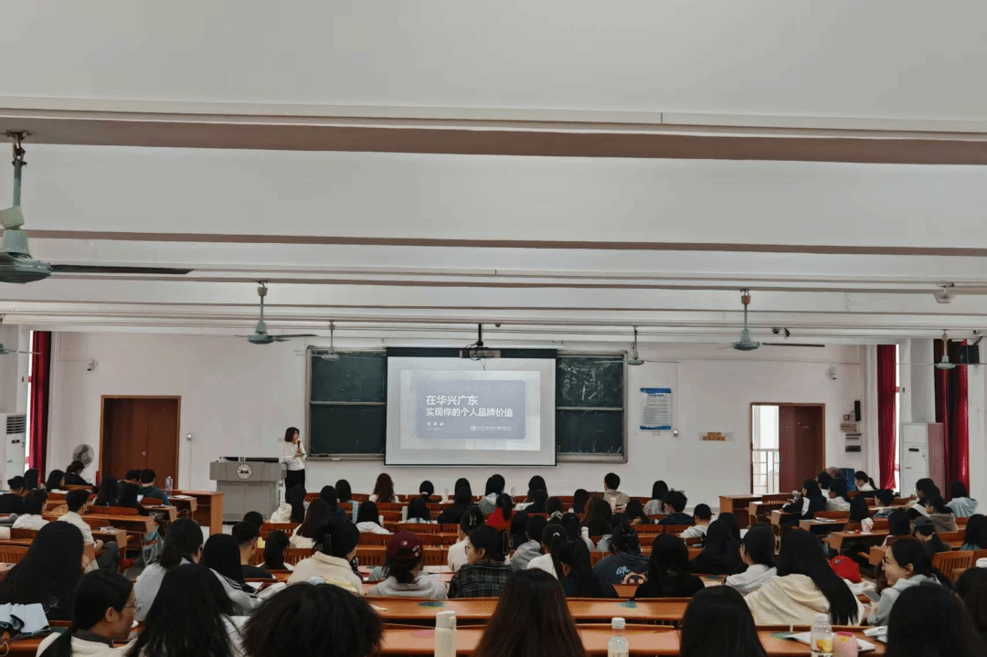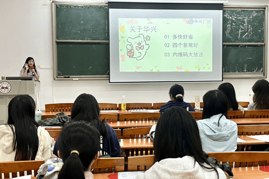 在宣讲会的最后环节,我校华兴广东校园大使欧阳学姐以一段精心制作的PPT和自制的实习纪实视频,向同学们展现了她在华兴广东的实习日常与成长故事,记录了她与团队协作的暖心瞬间。