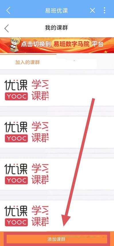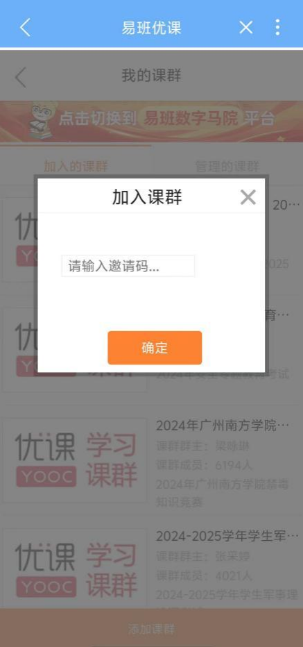 第三步:在我加入的课群点击【添加课群】 ,输入课群邀请码【9U48FA8V】,进入课群“广州南方学院合格评估应知应会知识测试 ”