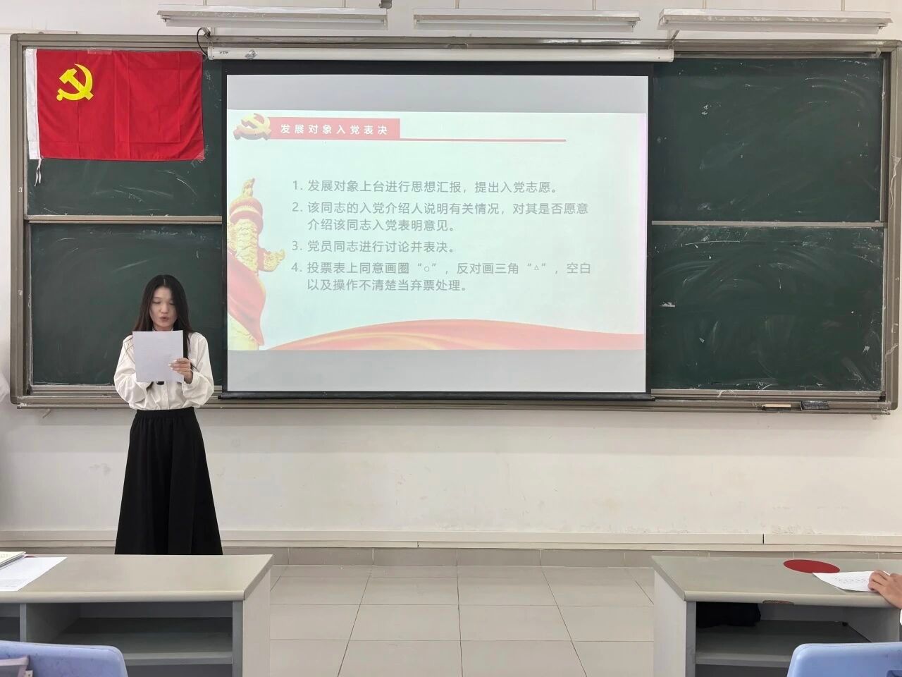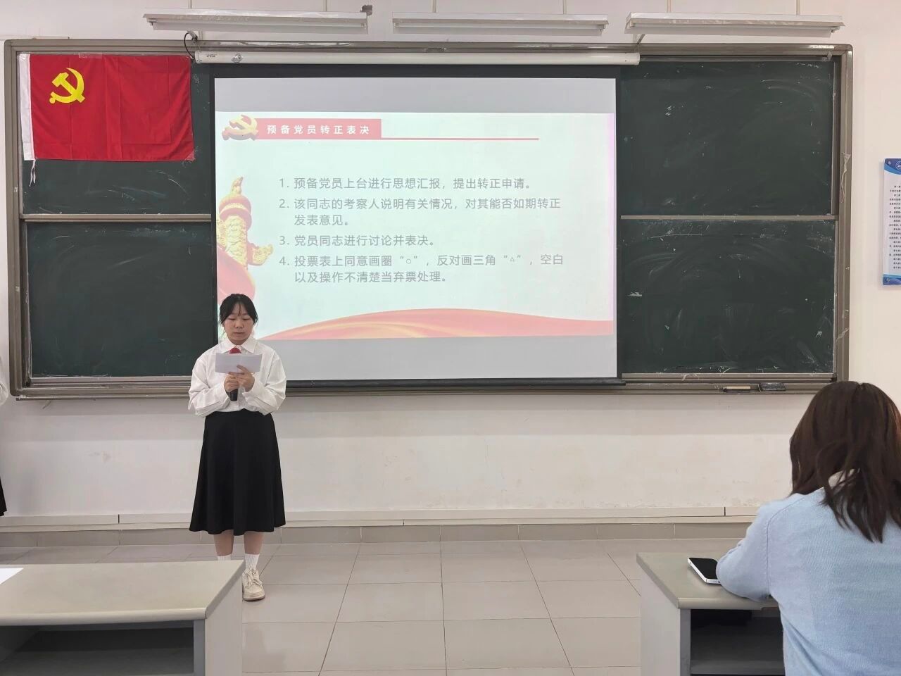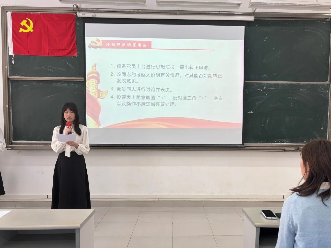 大会的第四项议程:宣读表决情况。经过与会正式党员的无记名投票表决,同意接收发展对象严静怡等5名同志顺利转为预备党员和预备党员罗庆霜等7名同志顺利转为中共正式党员。