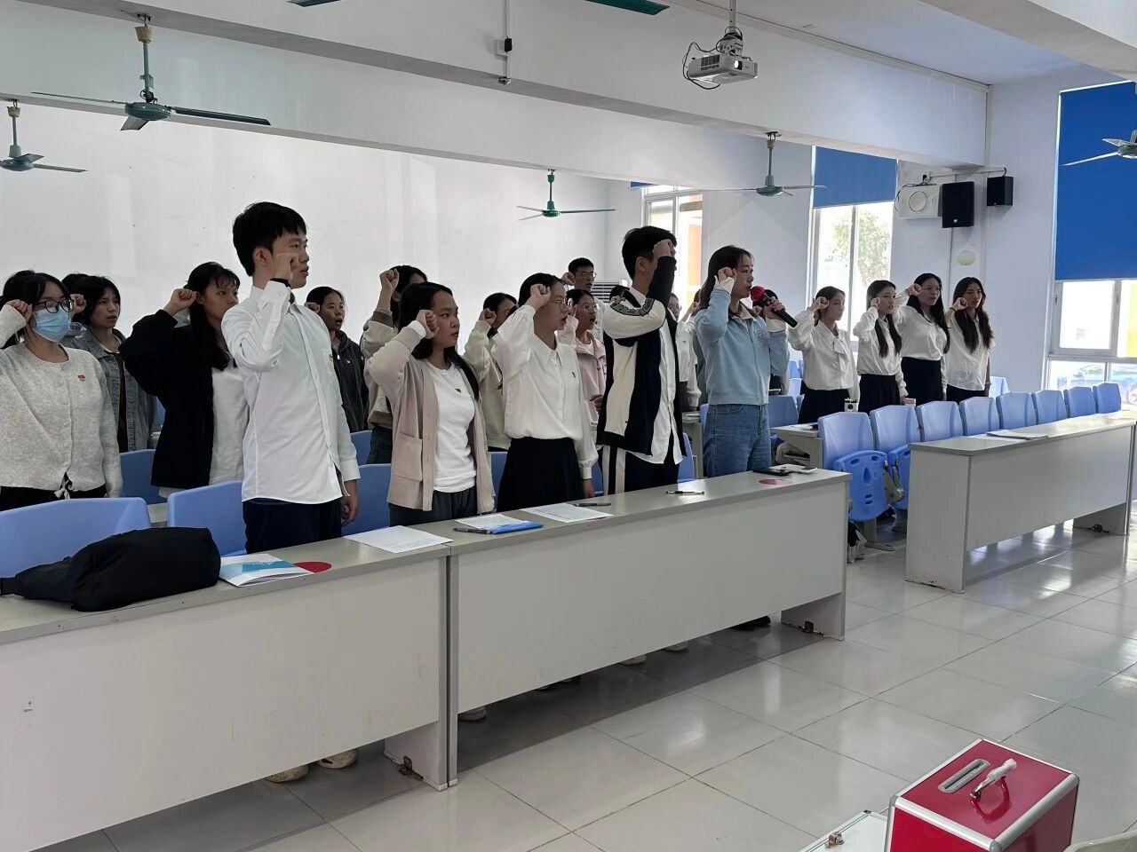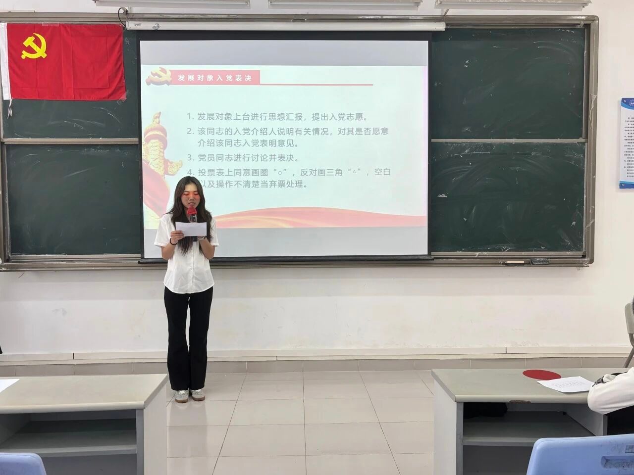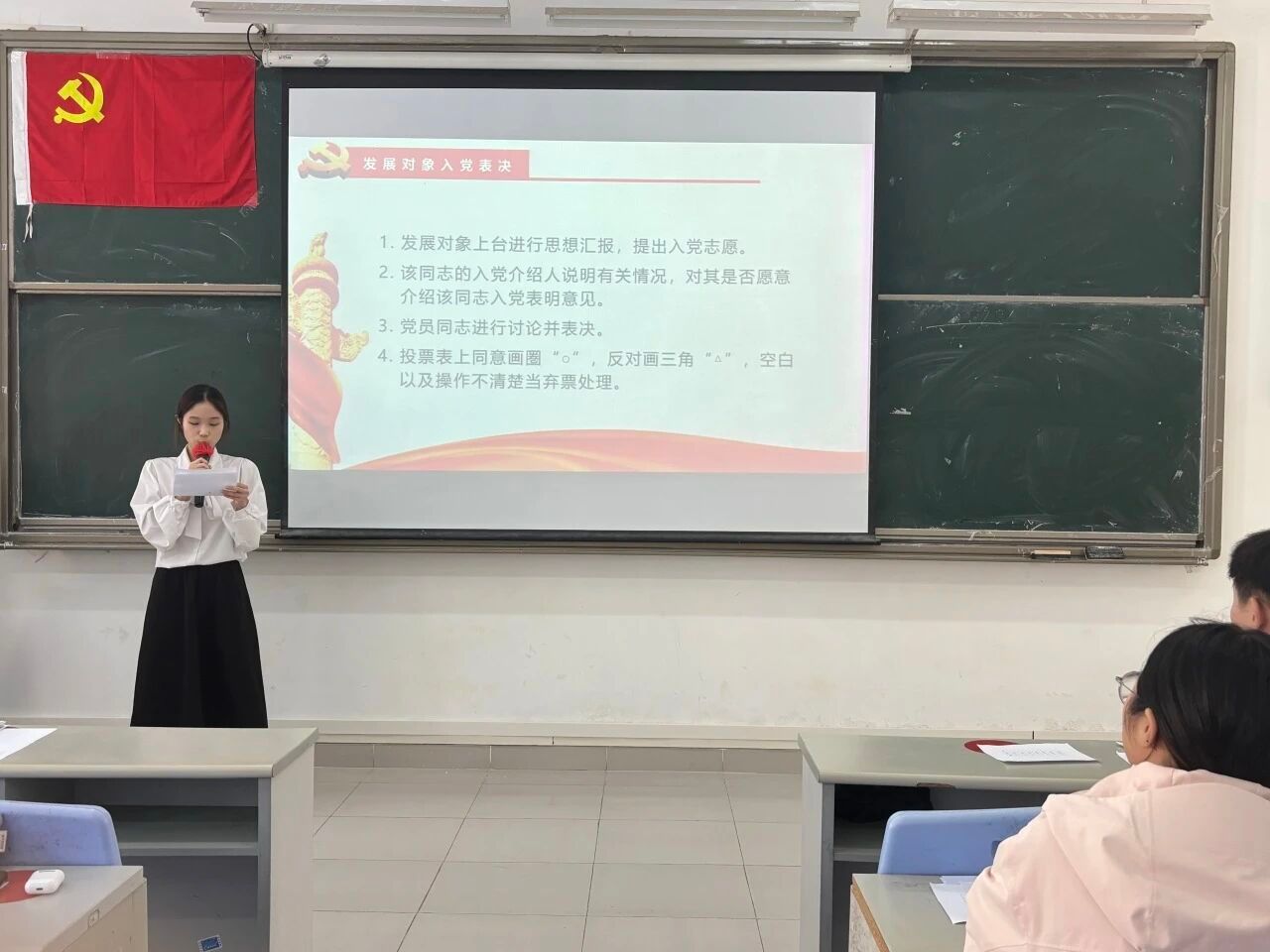 大会的第四项议程:宣读表决情况。经过与会正式党员的无记名投票表决,同意接收发展对象严静怡等5名同志顺利转为预备党员和预备党员罗庆霜等7名同志顺利转为中共正式党员。