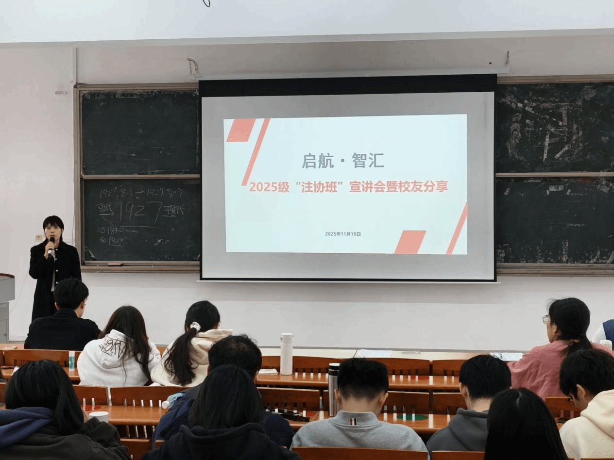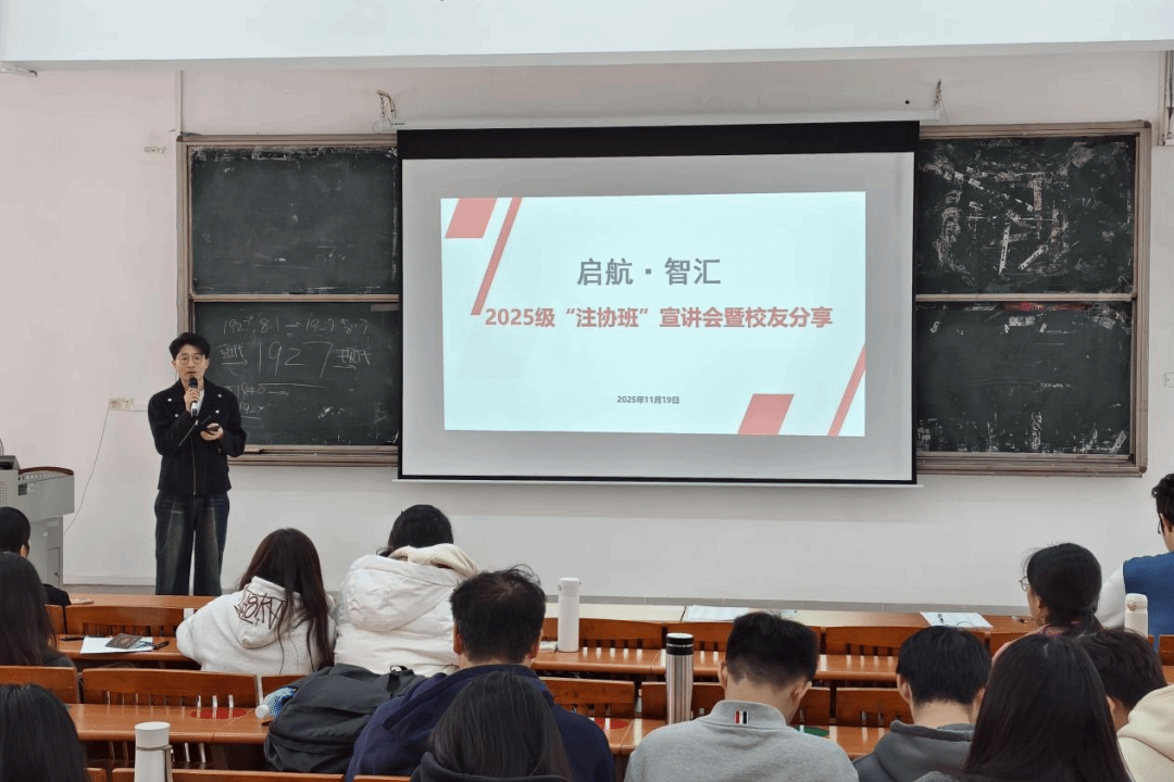 为培养高素质应用型财会人才,帮助我校大一学生深入了解审计行业发展动态、明晰职业发展路径,11月19日中午,会计学院在6教206召开了2025级“注协班”招生宣讲暨校友分享会。审计学系主任、“注协班”班主任何沁蔚老师、2017届校友梁晓怡、2019届校友敖杰林以及我院会计、审计、财管等专业同学参与了本次活动。