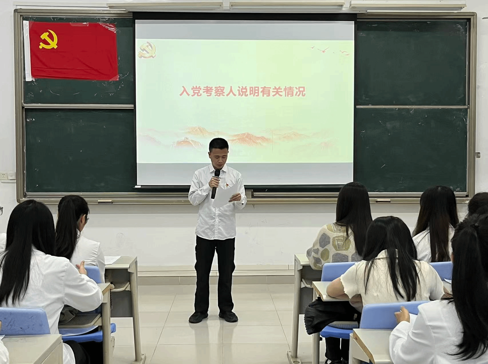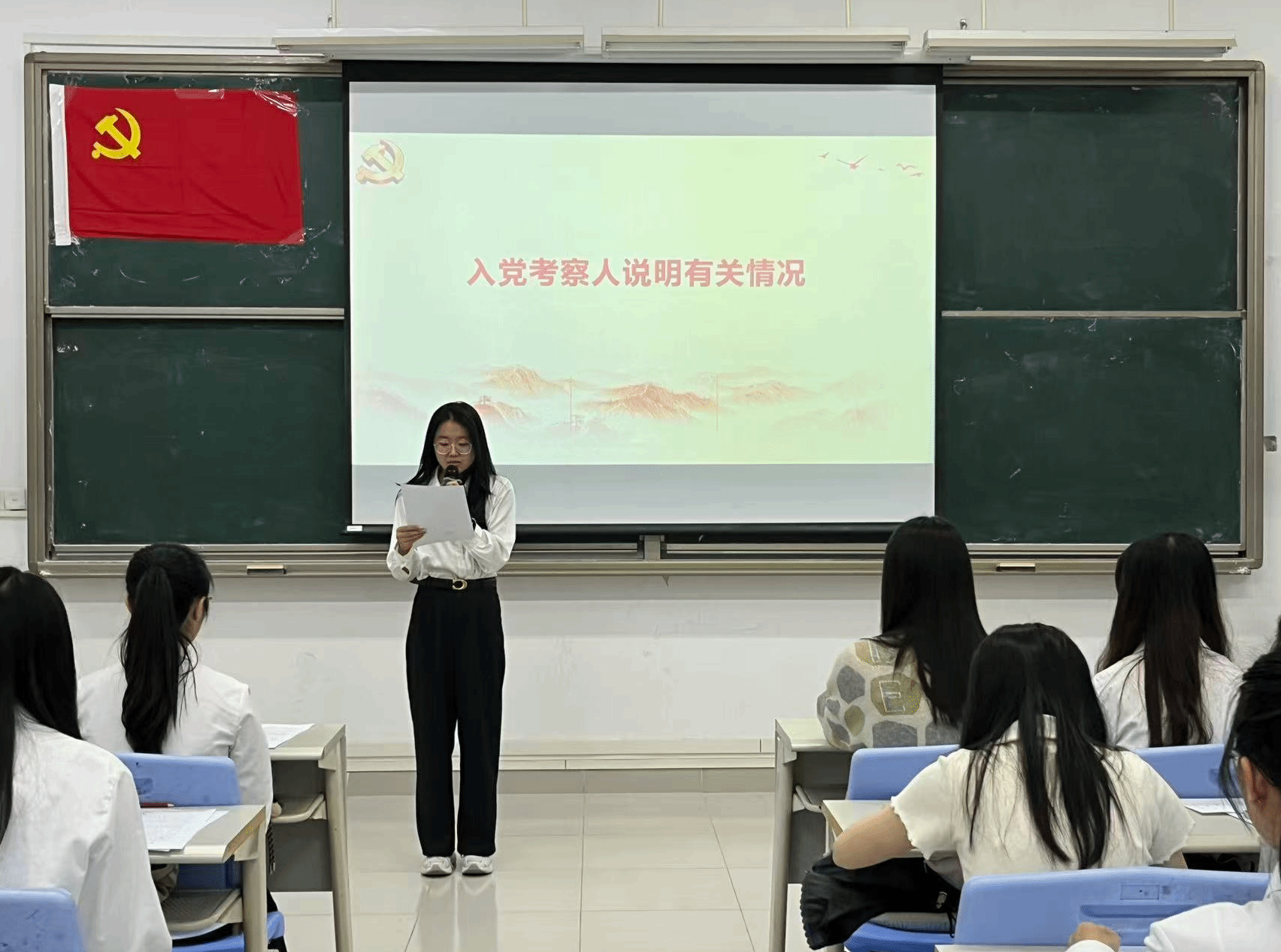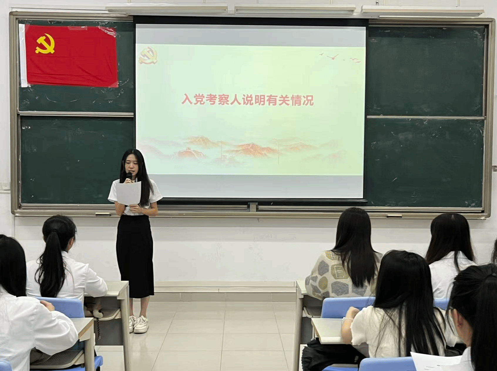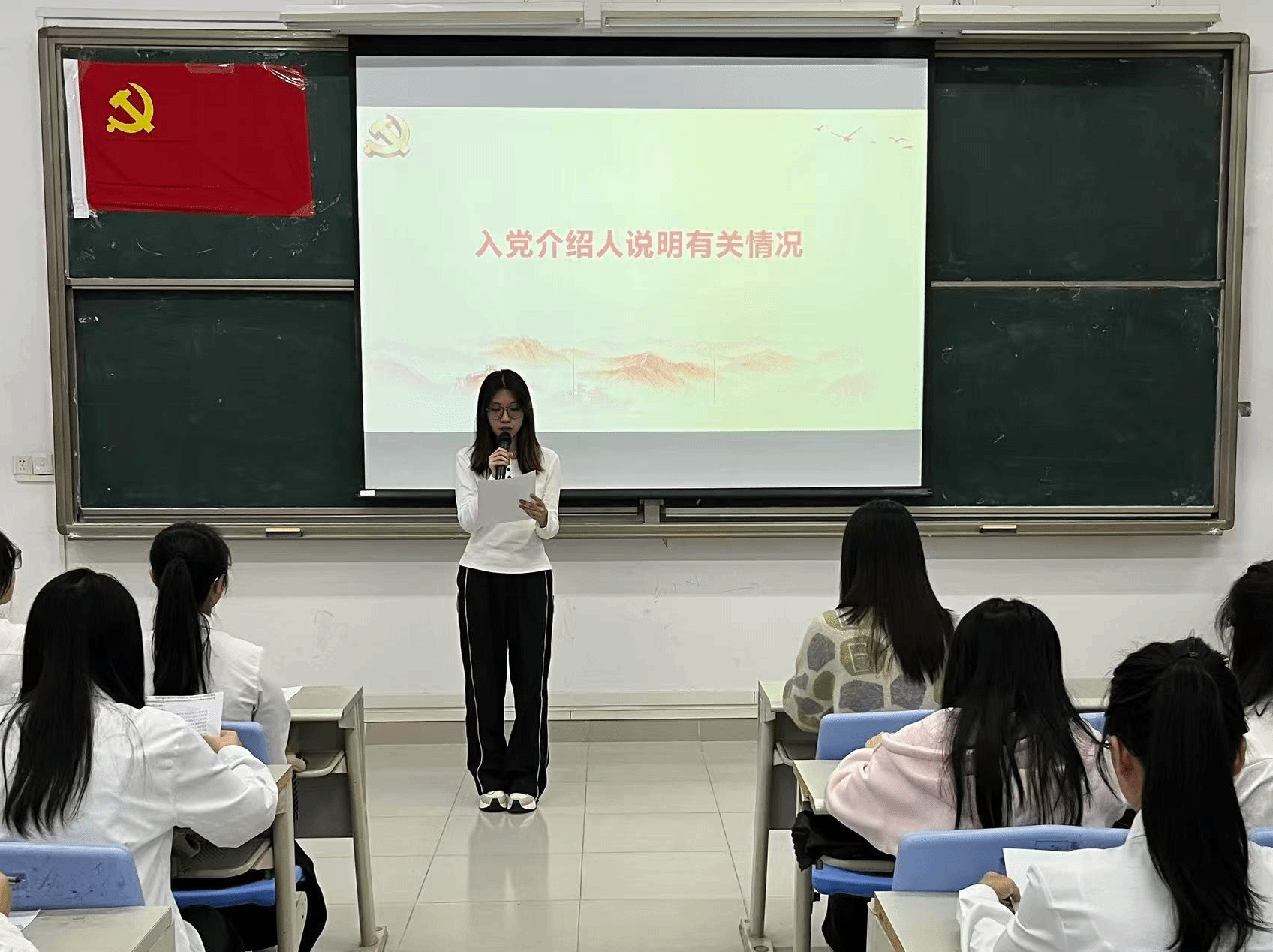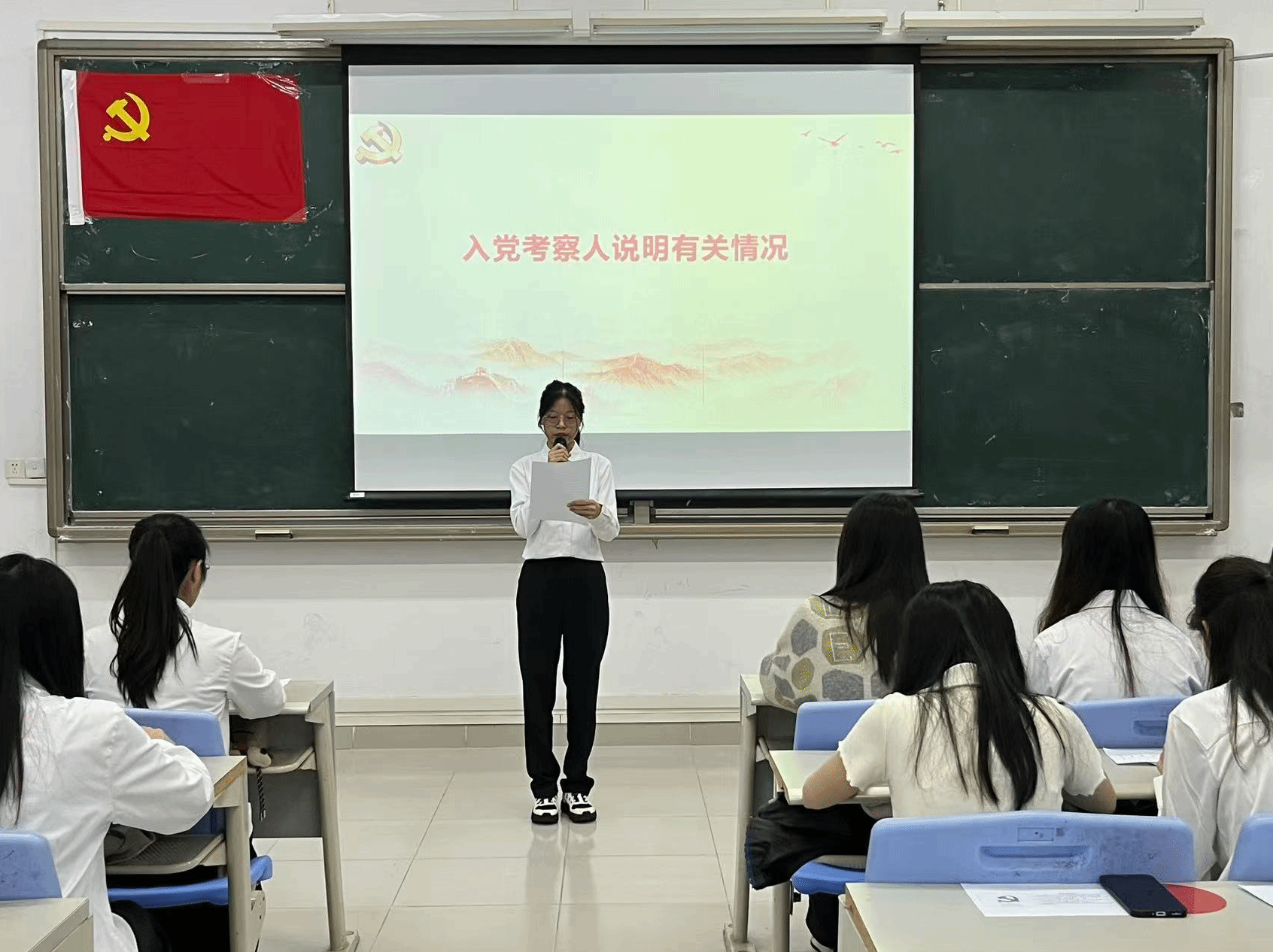 本项议程是对李霖芳等4名发展对象的入党问题进行讨论表决。发展对象依次上台作思想汇报,系统阐述个人思想认识、学习工作情况,全面展现对党的理论学习与入党决心。入党介绍人详细介绍了四位发展对象在思想、学习、工作及日常表现等方面的情况,对各发展对象在考察期间所做出的成绩和努力给予了肯定,并就其是否具备党员条件发表了意见。