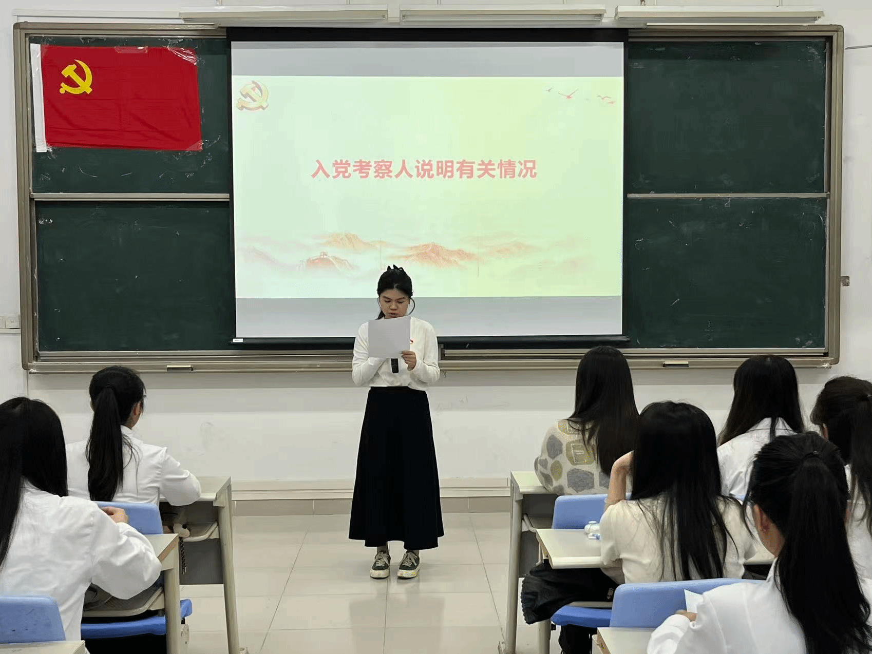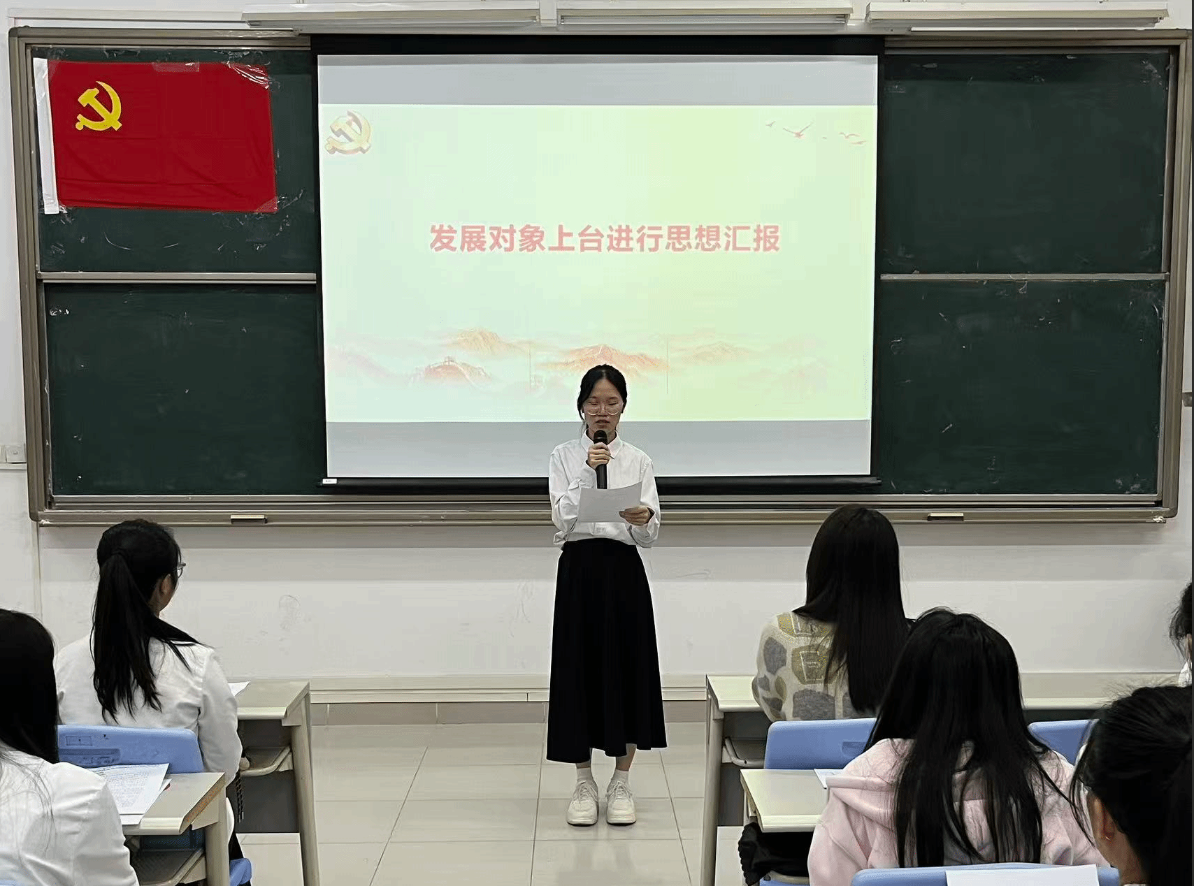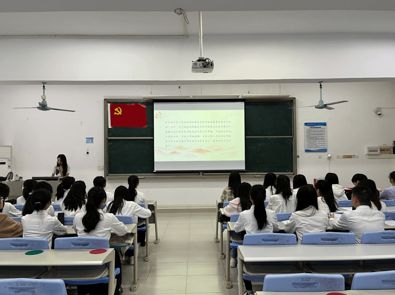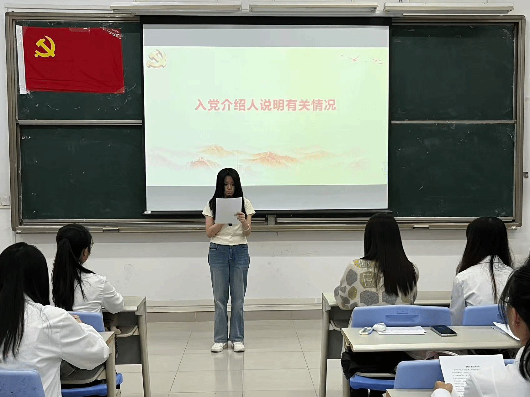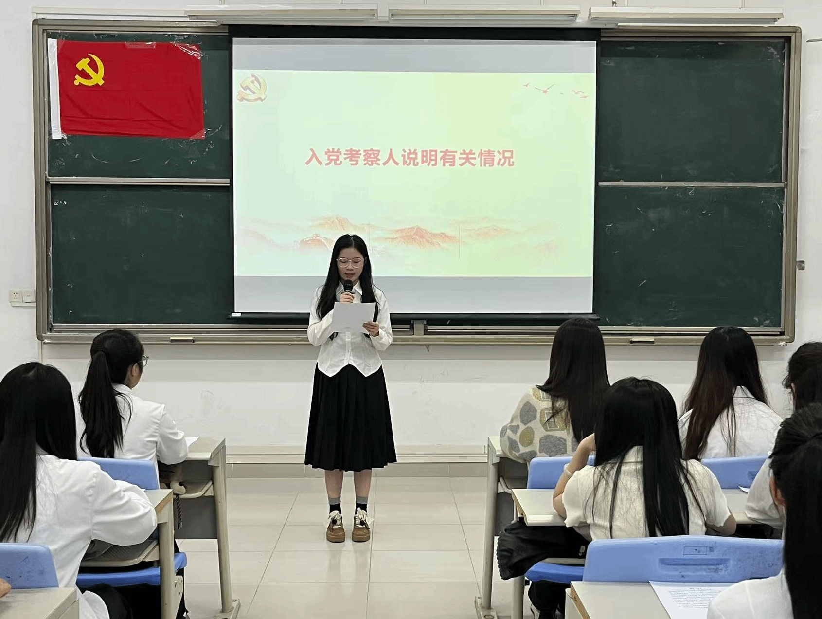 本项议程是对李霖芳等4名发展对象的入党问题进行讨论表决。发展对象依次上台作思想汇报,系统阐述个人思想认识、学习工作情况,全面展现对党的理论学习与入党决心。入党介绍人详细介绍了四位发展对象在思想、学习、工作及日常表现等方面的情况,对各发展对象在考察期间所做出的成绩和努力给予了肯定,并就其是否具备党员条件发表了意见。