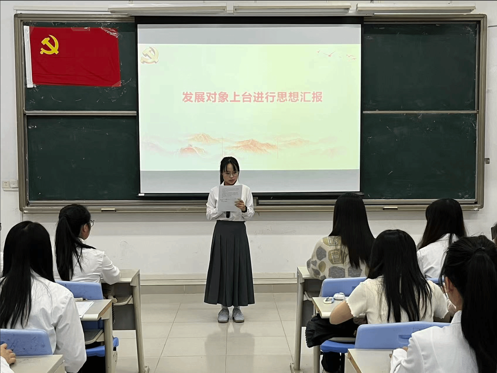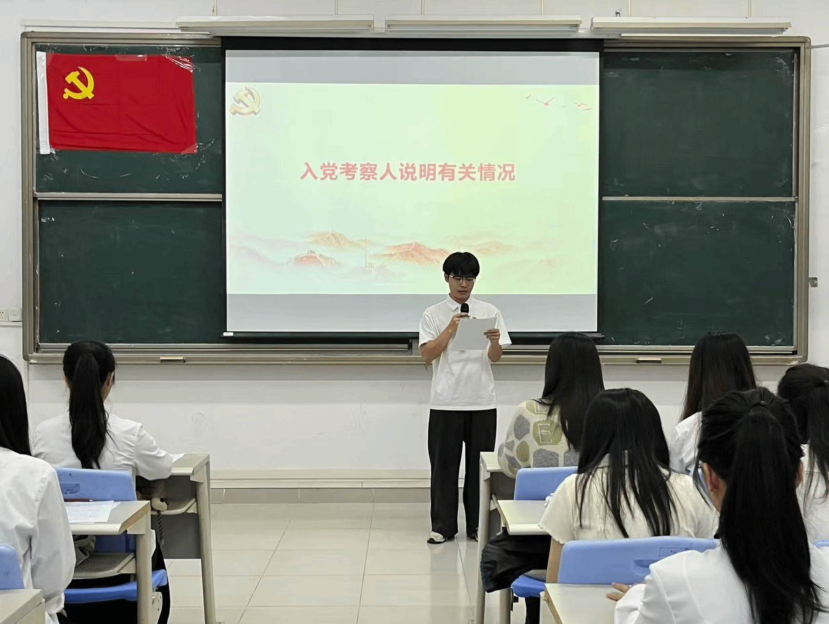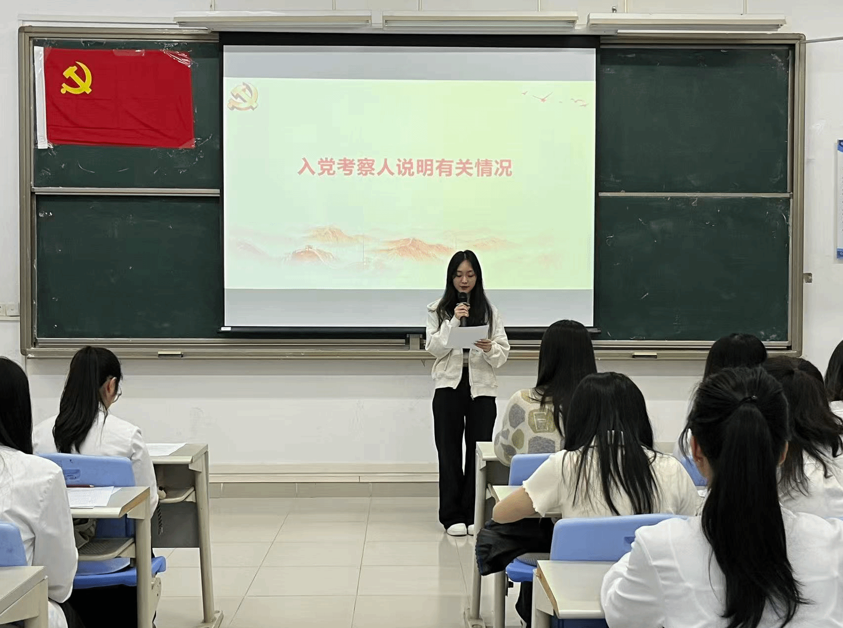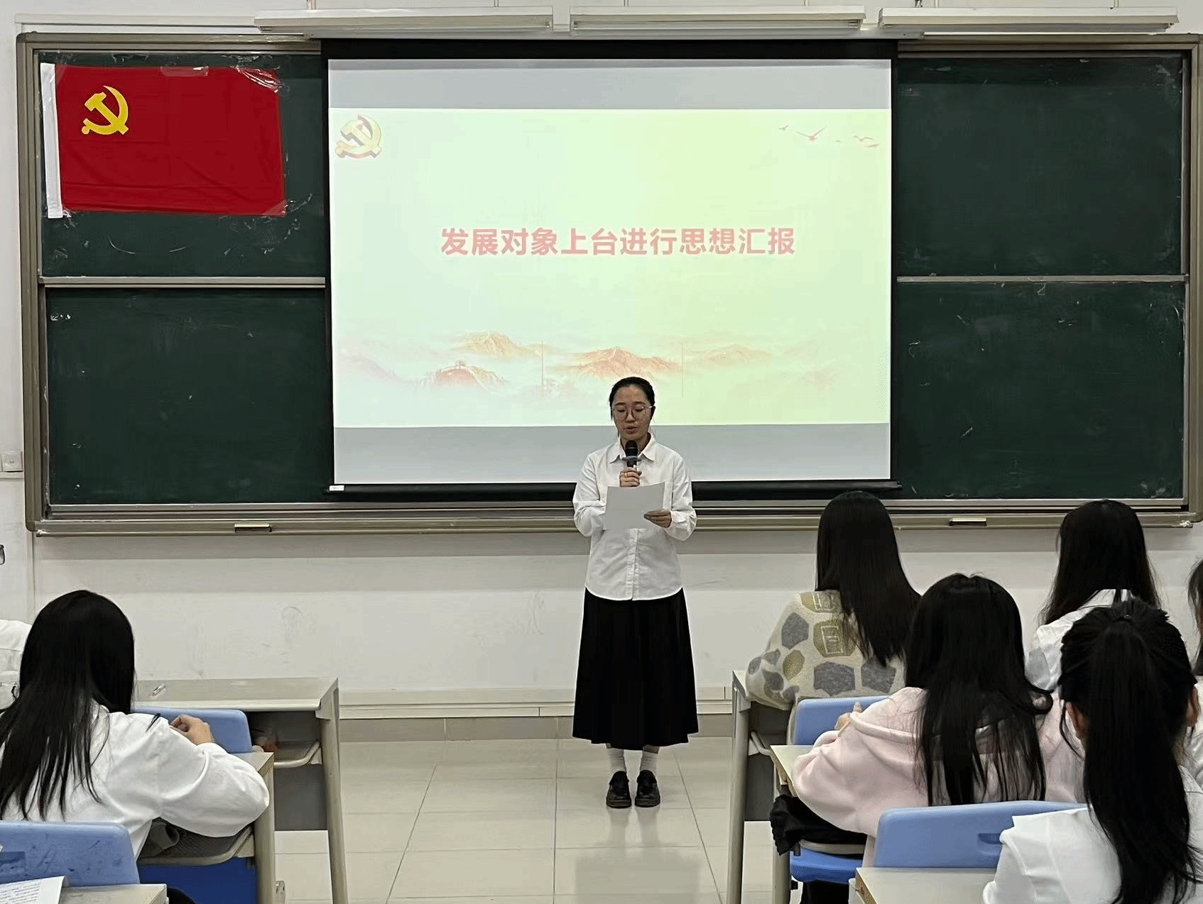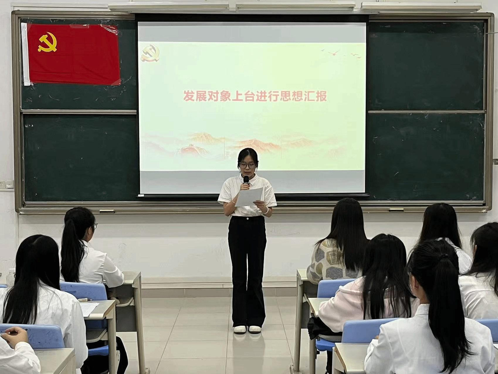 本项议程是对李霖芳等4名发展对象的入党问题进行讨论表决。发展对象依次上台作思想汇报,系统阐述个人思想认识、学习工作情况,全面展现对党的理论学习与入党决心。入党介绍人详细介绍了四位发展对象在思想、学习、工作及日常表现等方面的情况,对各发展对象在考察期间所做出的成绩和努力给予了肯定,并就其是否具备党员条件发表了意见。