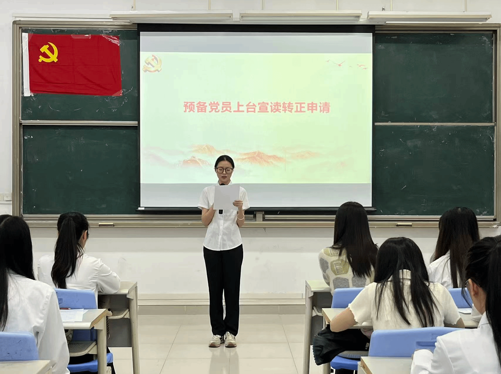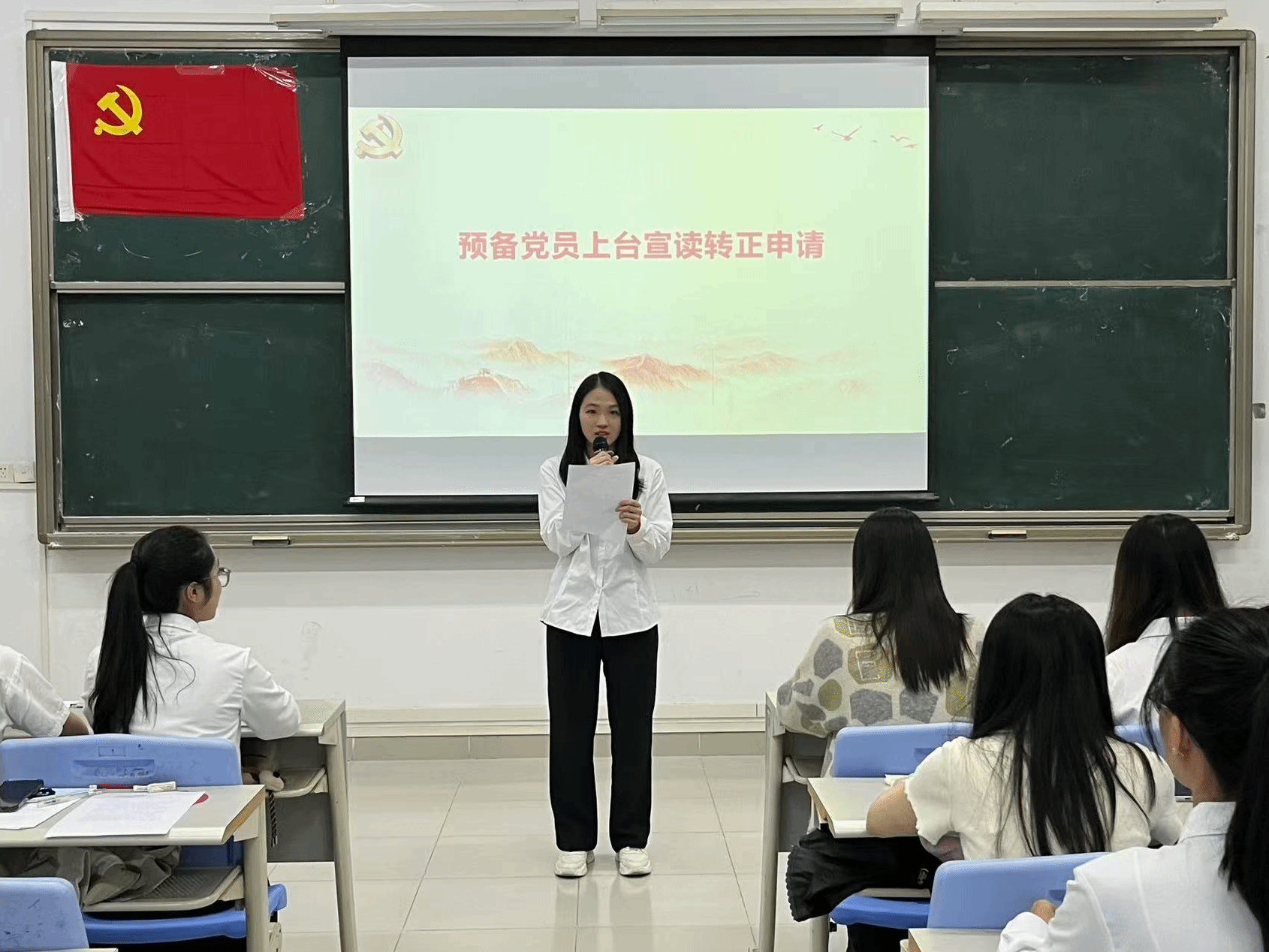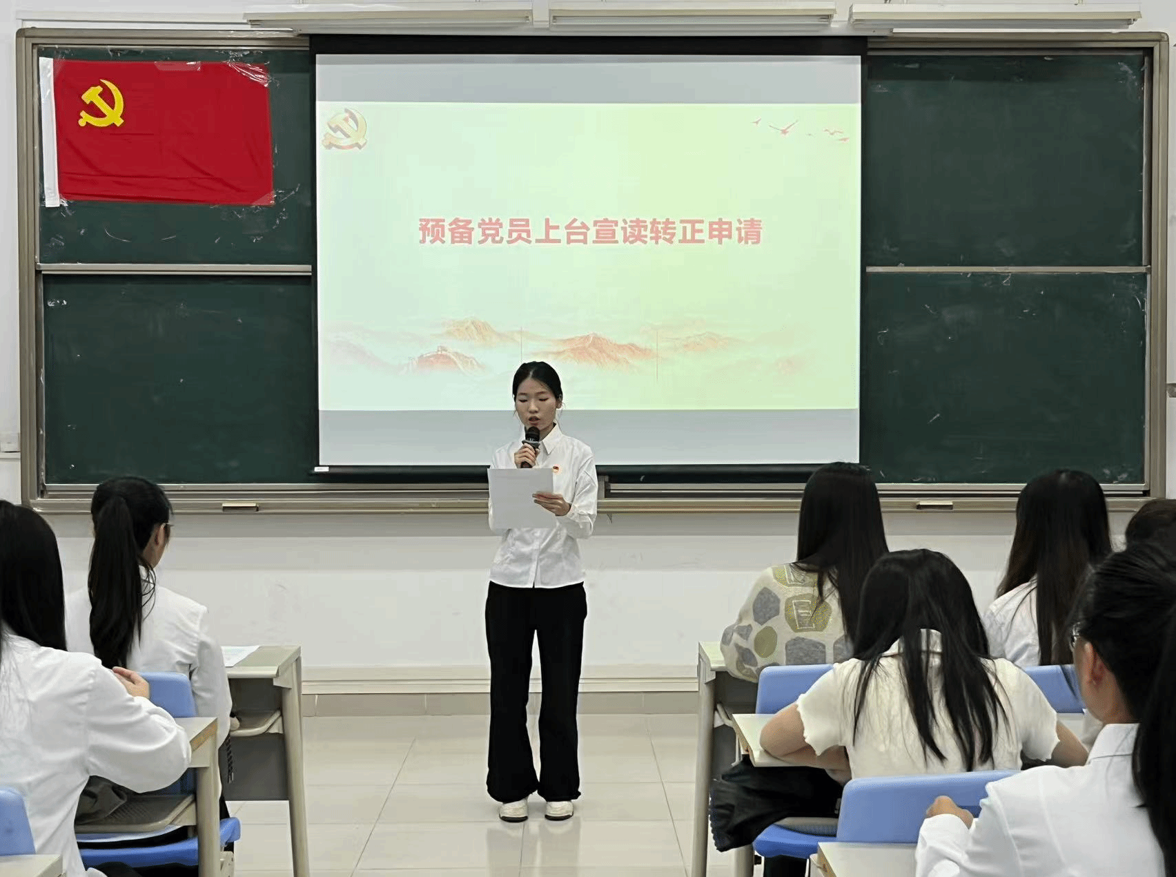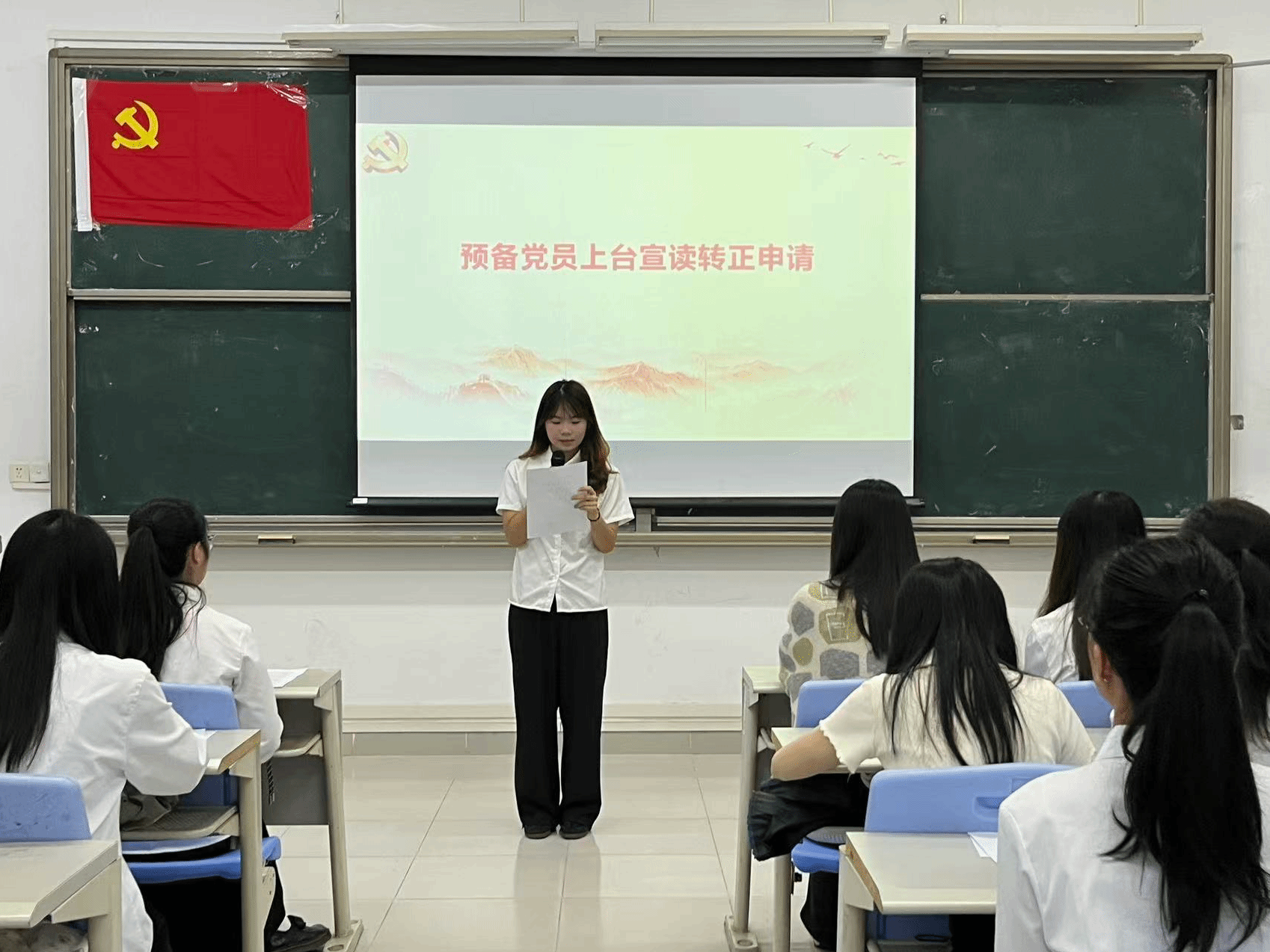 本项议程是对钟慧静等8名预备党员的转正问题进行讨论并表决。预备党员依次上台向党组织详细汇报预备期内思想动态、理论学习成效、实践服务等情况,并表示将会持续以一名优秀共产党员的标准严格要求自己,不断地提升政治觉悟。入党考察人依次就预备党员在考察期内的现实表现进行说明,重点反馈其在政治立场、组织纪律、先锋作用发挥等方面的表现,并明确提出是否同意其按期转正的意见。