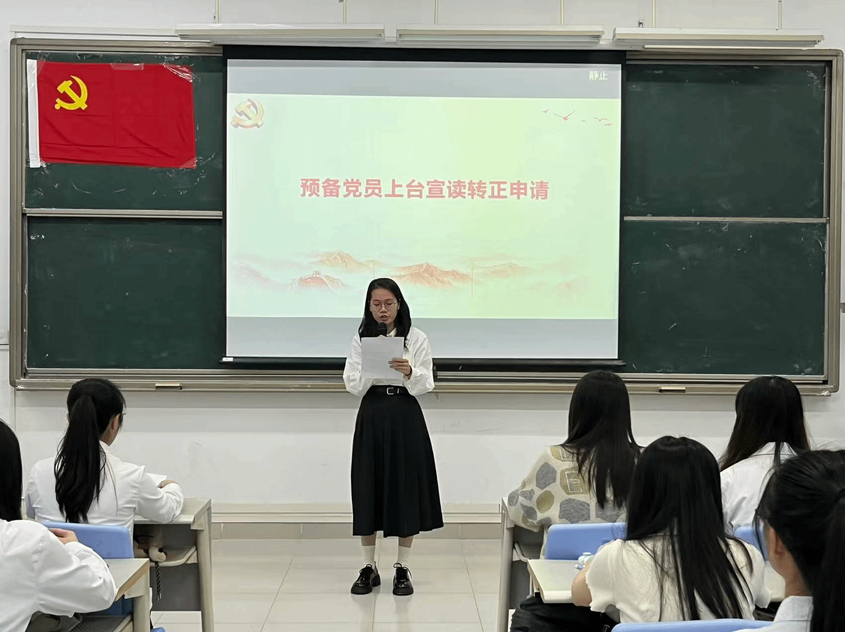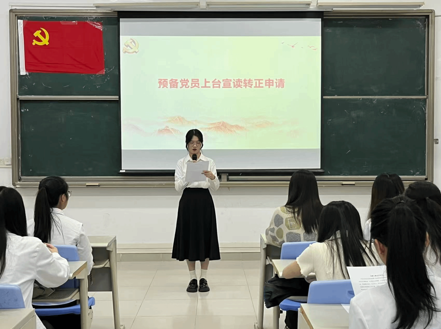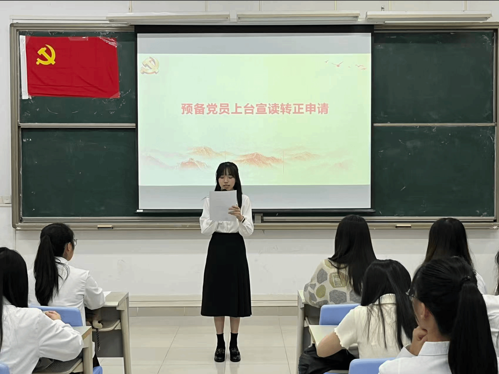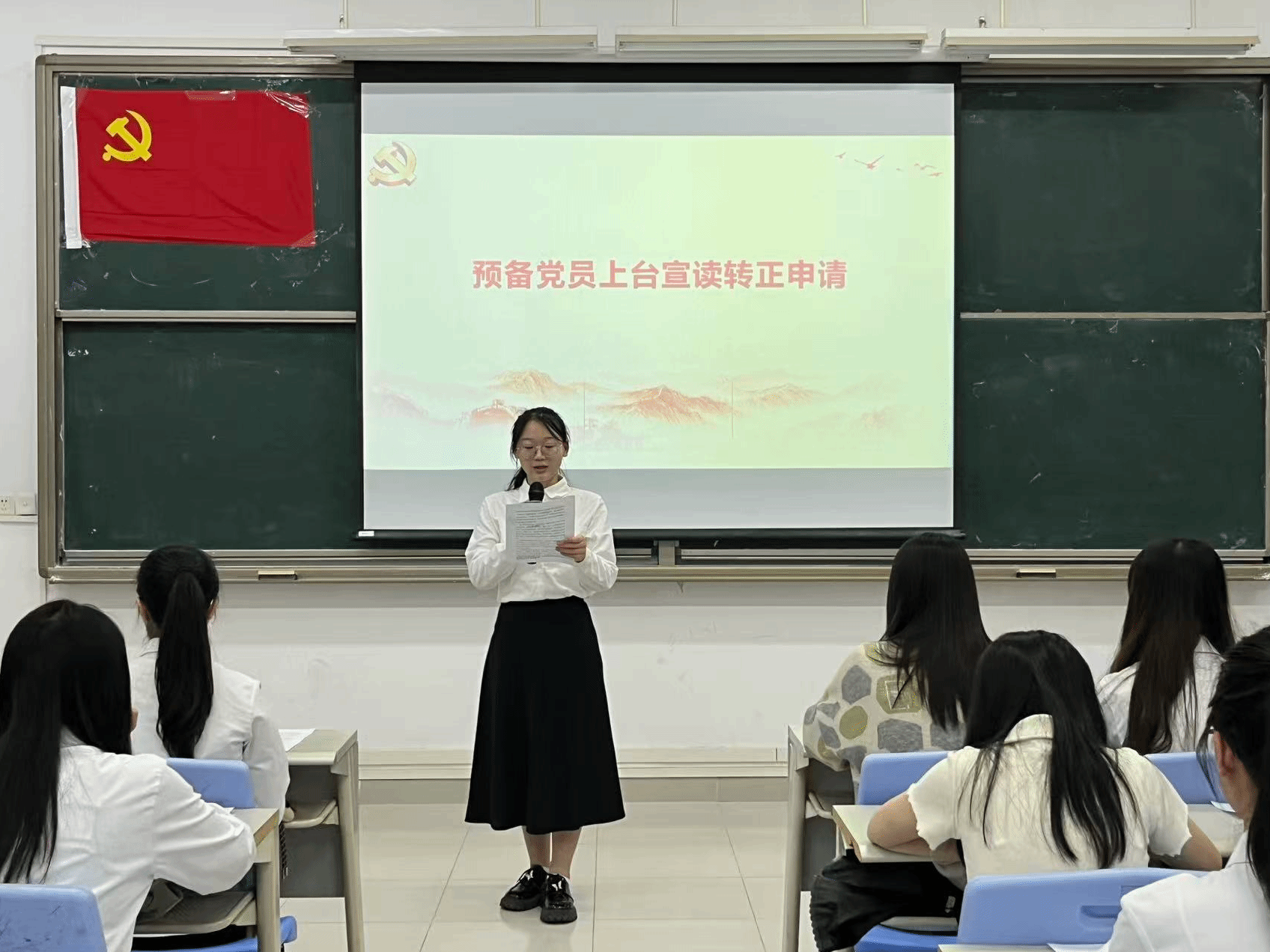 本项议程是对钟慧静等8名预备党员的转正问题进行讨论并表决。预备党员依次上台向党组织详细汇报预备期内思想动态、理论学习成效、实践服务等情况,并表示将会持续以一名优秀共产党员的标准严格要求自己,不断地提升政治觉悟。入党考察人依次就预备党员在考察期内的现实表现进行说明,重点反馈其在政治立场、组织纪律、先锋作用发挥等方面的表现,并明确提出是否同意其按期转正的意见。