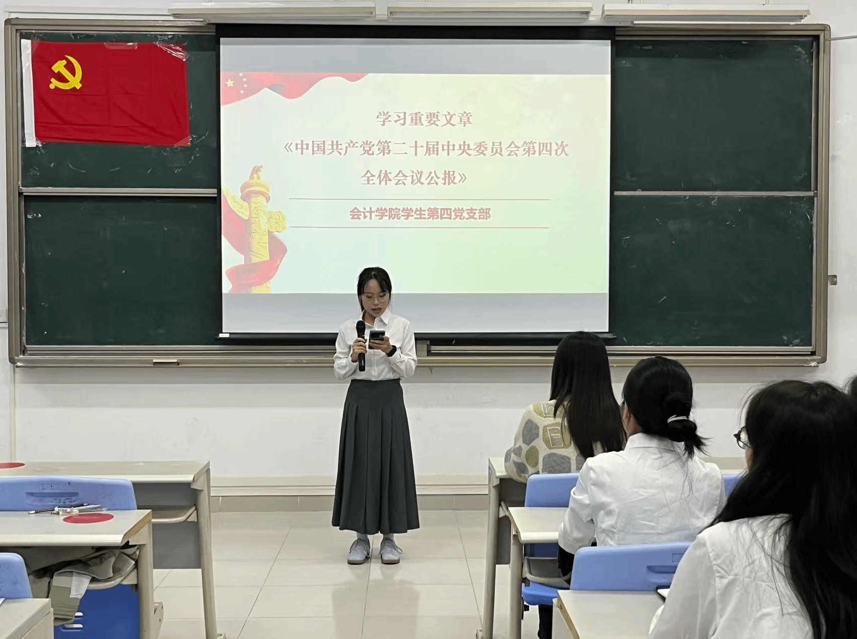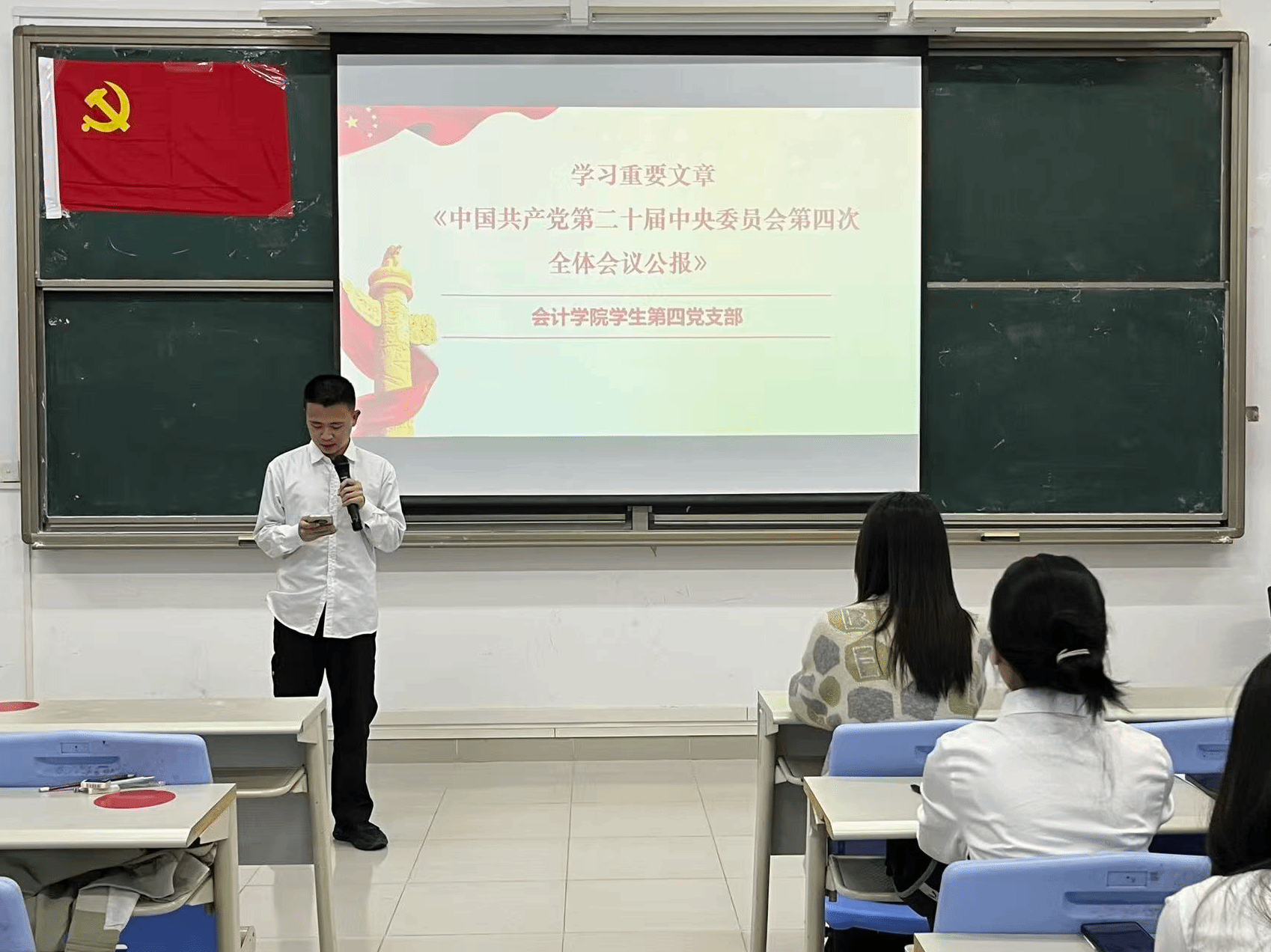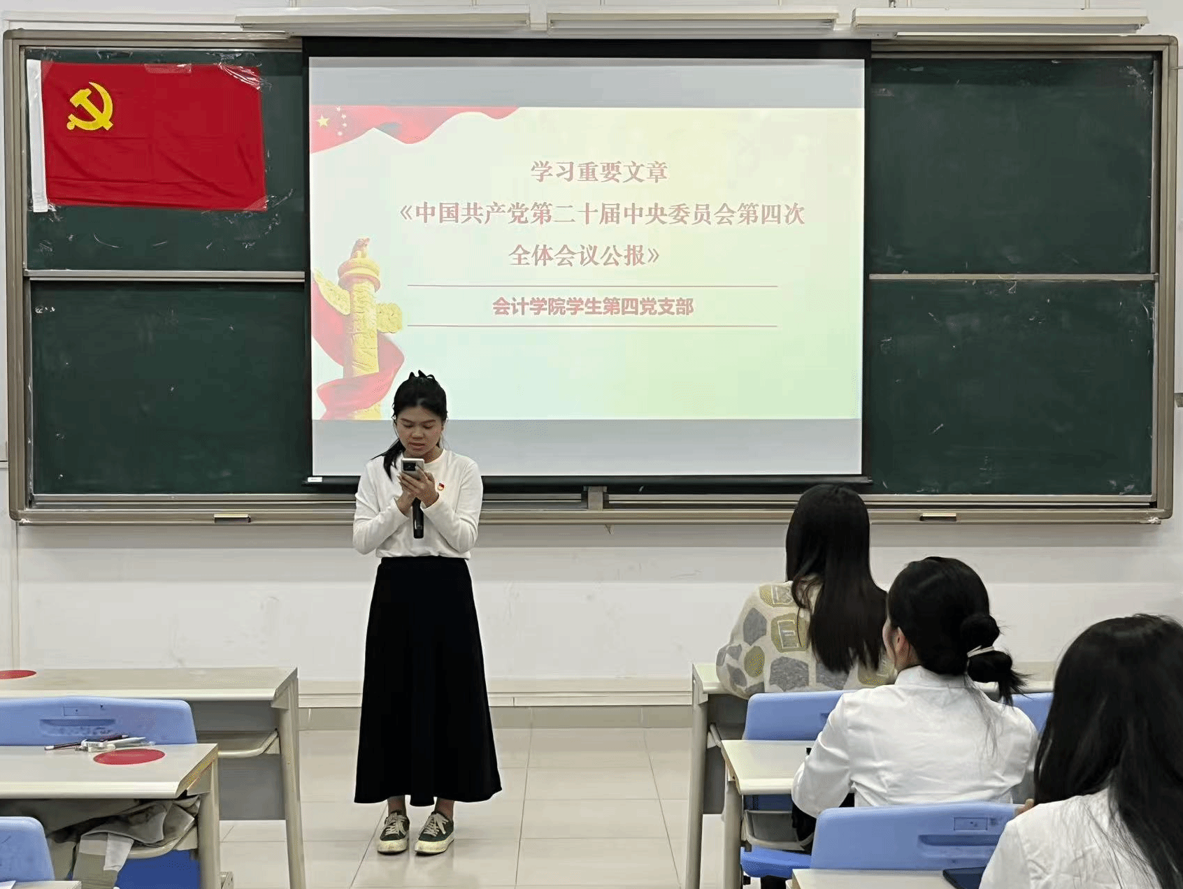会计学院学生第四党支部以“学思想、强党性、重实践、建新功”为主题召开组织生活会。组织生活会的第一环节为11月份第一议题的理论学习研讨,以党小组为单位学习重要文章—《中国共产党第二十届中央委员会第四次全体会议公报》,并进行小组讨论,各党小组代表依次有序上台发表学习心得。
