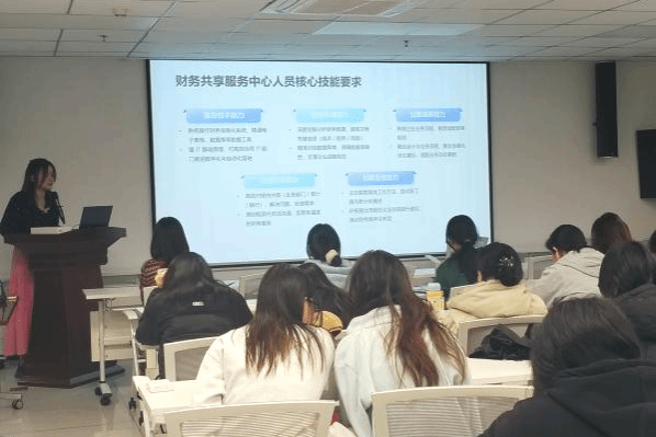 上午培训伊始,企业讲师以《财务共享中心的构建、运作及未来演进》为主题,带来了系统性的知识讲解。从传统分散式财务管理模式的痛点剖析切入,逐步深入解读财务共享中心(FSSC)的架构设计与核心定位。讲解过程中,同学们专注聆听、认真记录,不时就“传统财务的痛点”“财务共享中心如何操作”等问题与讲师展开交流互动。