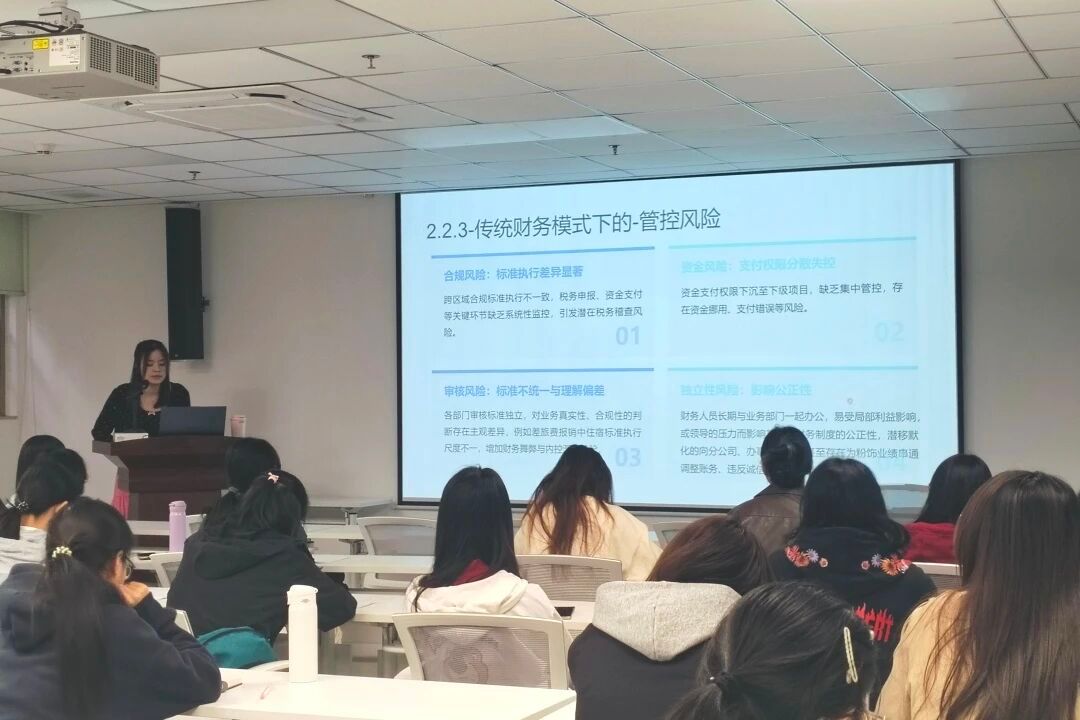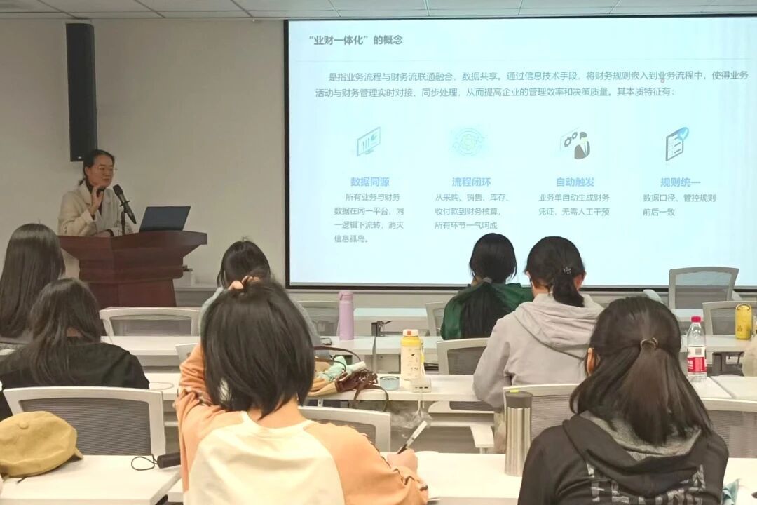 下午的培训聚焦技术赋能,围绕《信息系统在财务管理领域的应用》主题进行交流。培训伊始,讲师通过电商财务流程进行提问,学生们热情高涨,纷纷结合课堂所学知识回答,讲师以此展开,围绕“业财一体化”核心,讲解了业务驱动财务的底层逻辑、业财数据无缝对接的实现方式,以及凭证自动化、银企直联等实用功能的应用场景。在财务智能化板块,从财务机器人的流程自动化应用,到财务数据可视化的决策支撑,再到财务大模型的前沿探索,讲师通过案例演示与现场远程操作,将抽象的技术概念转化为直观的行业实践,让师生们真切感受到人工智能、大数据等技术为财务管理领域带来的效率革命与模式创新。