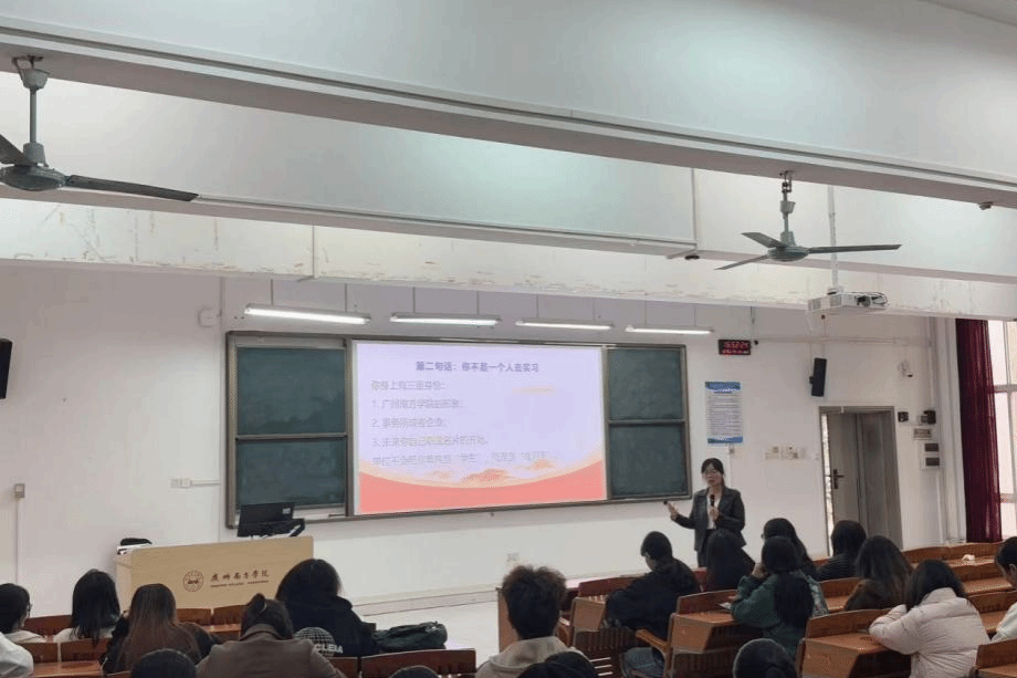 动员会伊始,基础教研室主任宁军容老师以轻松互动开启分享。她了解到同学们对实习怀揣着“紧张”与“期待”交织的复杂心情,并以自己本科期间在襄樊福达东康曲轴有限公司的实习经历为例,亲切讲述了实习如何帮助她清晰未来规划,找到自我发展的适配路径。