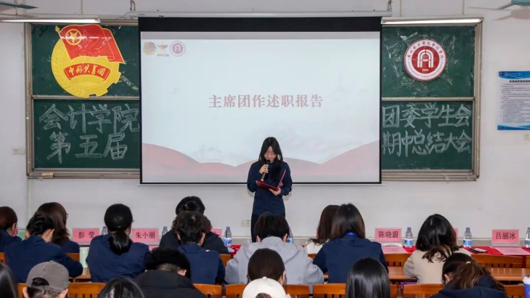 主席团成员吴洽仪、彭莹与团委学生兼职副书记吕丽冰、黎思敏依次作本学期工作述职汇报。汇报围绕工作成效、存在问题与改进方向三个层面展开,在系统总结阶段成果的同时也客观指出了当前工作中存在的不足,如活动执行精细化程度有待提升、应急响应机制不够健全、部门协同与学生积极性仍需加强等。针对以上问题,她们提出了加强过程复盘与督导、推动跨部门联动协作、优化制度保障与培训体系、完善激励机制等一系列具体改进措施。最后,她们号召全体成员保持热情、务实进取,协力提升团学工作的整体水平。