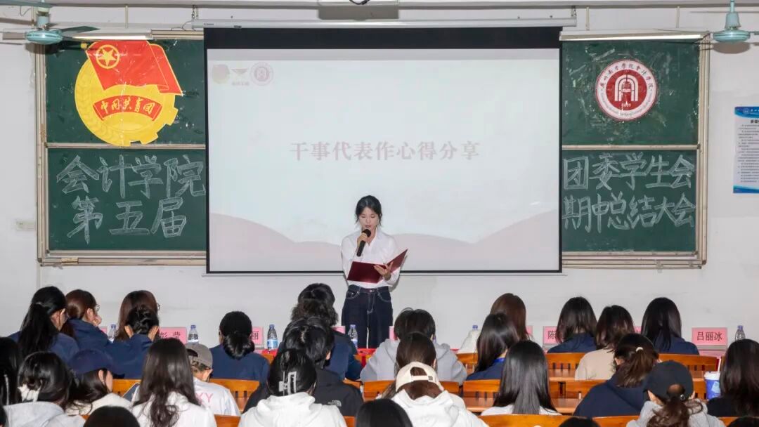 干事代表——组织部的陈铭心与李向颖分别上台发言。陈铭心同学结合自身参与活动策划与组织的实践经历,回顾总结了在工作中的收获与成长,分享了在统筹协调与细节落实中积累的经验。李向颖同学则以参与的志愿服务与义教活动为切入点,讲述了在实践中深入社会、服务他人的真切感悟。两位代表的发言朴实恳切、情感真挚,展现出团学成员在实际工作中学习、在服务同学中收获成长的踏实足迹。