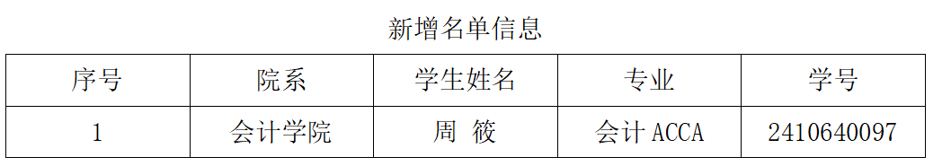 根据《广东省学生资助资金管理实施办法》《广州南方学院全日制本科生国家奖助学金实施办法》等文件规定,为做好我院2024-2025学年国家励志奖学金评审工作,我院组织符合条件的同学申请,在充分考察、协商、评议的基础上,经资格审查,新增2024级会计ACCA专业周筱同学为2024-2025学年国家励志奖学金拟推荐人员,特此公示。