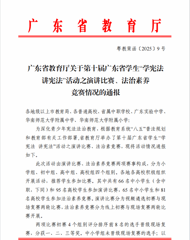 第十届广东省学生“学宪法 讲宪法”活动由广东省教育厅主办,以深化青少年宪法法治教育为核心目标,分为演讲比赛和法治素养竞赛两大类别,覆盖小学、初中、高中、高校四个组别,吸引了全省各地及粤港澳地区众多学子参与。活动历经线上初赛与现场复赛两轮激烈角逐,凭借严格的评审标准和专业的竞赛流程,成为检验全省学生宪法法治素养的重要平台。