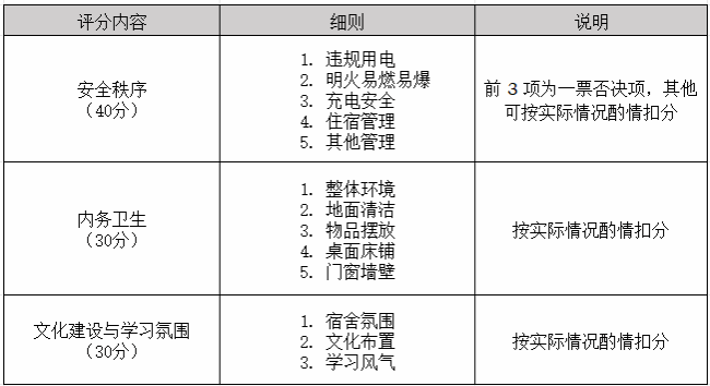本次评比实行100分制扣分规则,考核内容涵盖安全秩序(40分)、内务卫生(30分)、文化建设与学习氛围(30分)三大板块。若检查中发现违规行为,将严格依据《广州南方学院学生违纪处分管理办法(2025年修订)》严肃处理。请各宿舍对照评比评分标准,逐项排查问题,立行立改,确保符合评比要求。