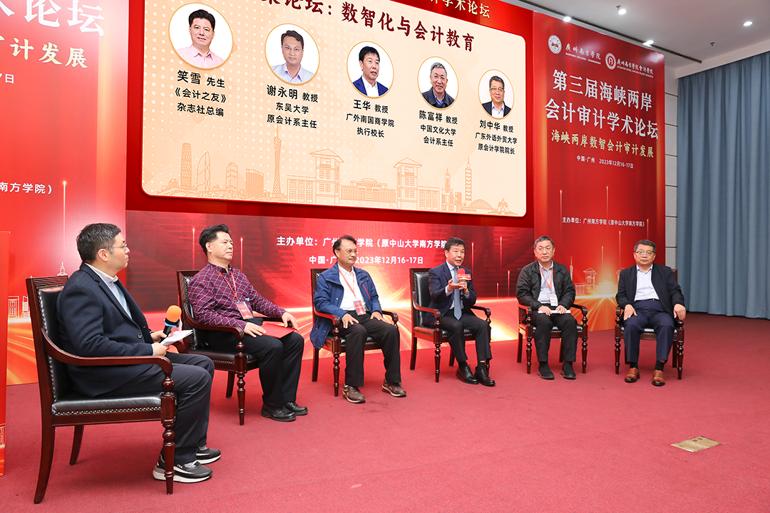 平行论坛后,进行了圆桌论坛。由广州南方学院会计学院董成杰副院长主持,广外南国商学院执行校长王华教授、中国文化大学的陈富祥教授、东吴大学的谢永明教授、广东外语外贸大学的刘中华教授、《会计之友》杂志社总编笑雪先生围绕“数智化与会计教育”进行了精彩的讨论。王华教授指出ChatGPT对会计教育带来巨大冲击,教师应当注重人机协作,提升科技背景下会计教育能力。陈富祥教授分享了中国文化大学在智能会计领域的宝贵教学经验。谢永明教授深入分析了AI如何影响会计、审计,以及如何应对AI带来的挑战,并从学生、教师、学校三个层面分享了东吴大学差异化战略实施路径。刘中华教授从企业对会计人才的真实需求出发,提出了高校教育转型的目标和方向,可以从“走出去”、“请进来”两方面着手强化校企协作。笑雪总编基于 2021 年财政部的三大规划提出了新时代审计的教育培养方向,并结合《会计之友》的数智化选题,为高校教师的科研方向提出了宝贵的建议。