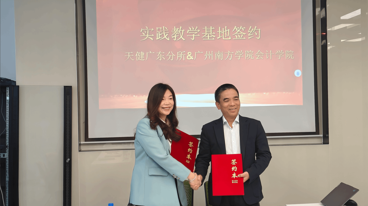 在全体参会人员的共同见证下,广州南方学院会计学院与天健会计师事务所广东分所双方代表上台,郑重签署实习基地合作协议,标志着双方在人才培养、实践教学等方面的合作正式落地。