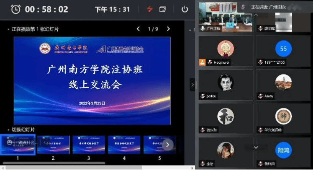 2022年3月23日下午,广州南方学院与广州注册会计师协会(以下简称“广州注协”)合办的注协班项目于线上召开交流会。广州注协副会长兼秘书长朱子放、副秘书长李泳茹、主任罗唯,会计学院执行院长卫建国、副院长张媛,及16名实务导师代表、2020级注协班全体同学参加了本次会议。